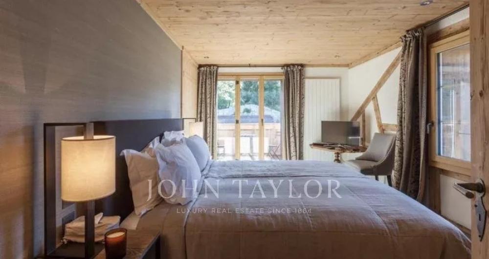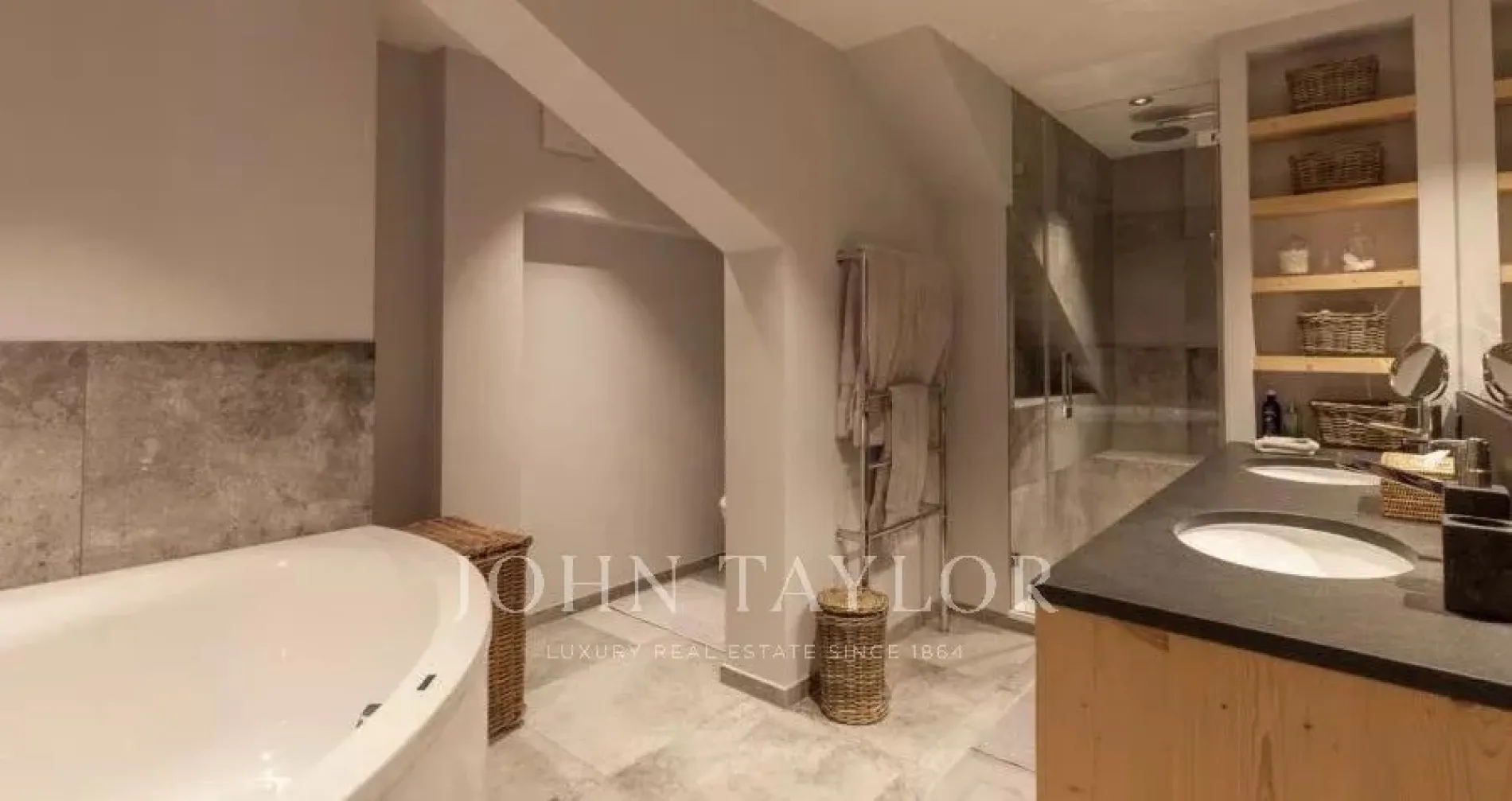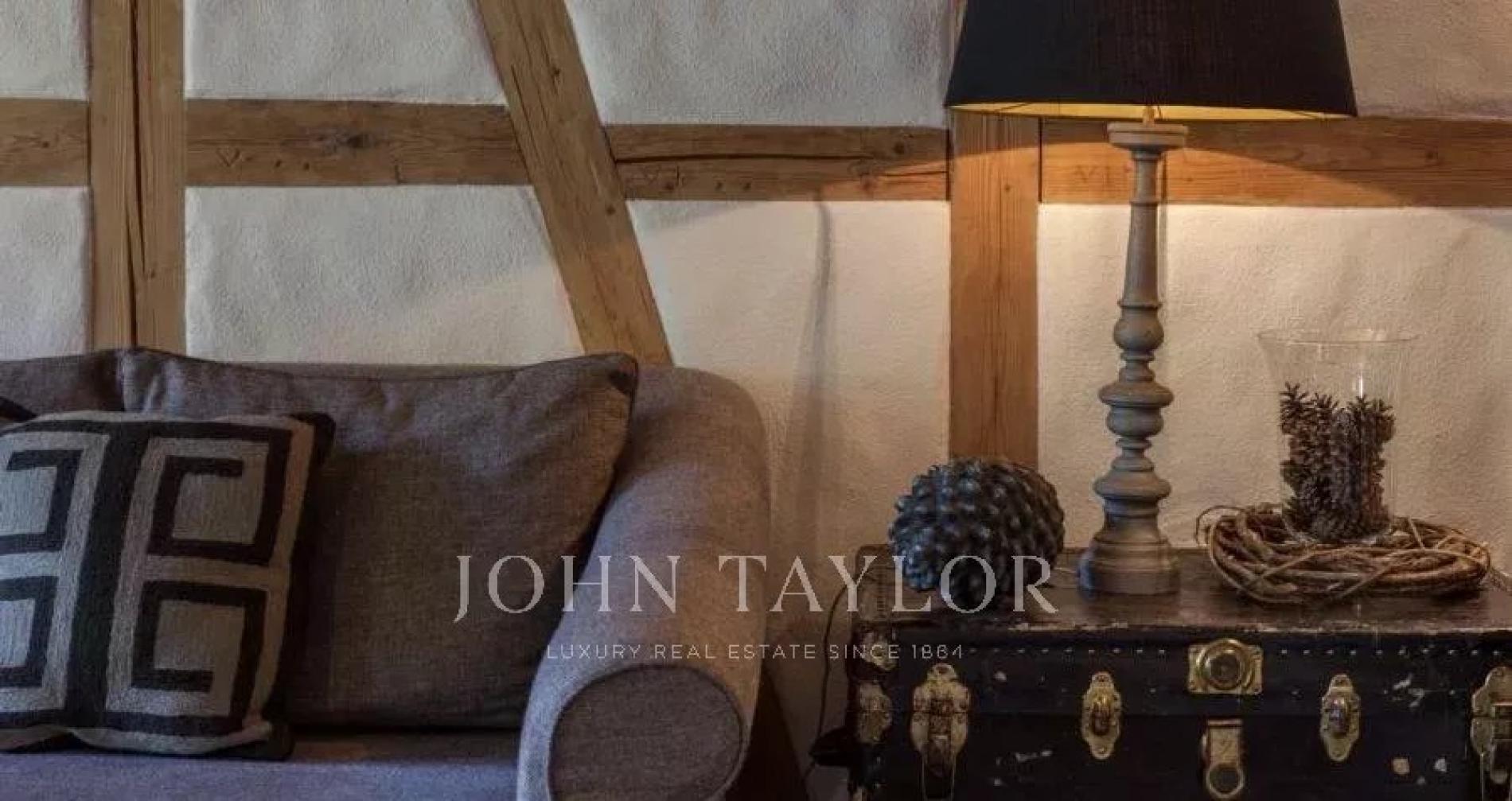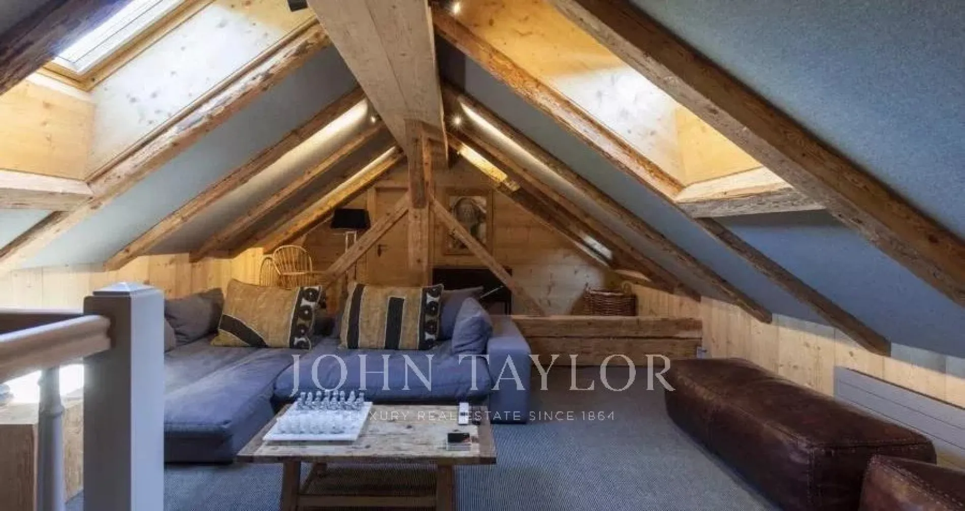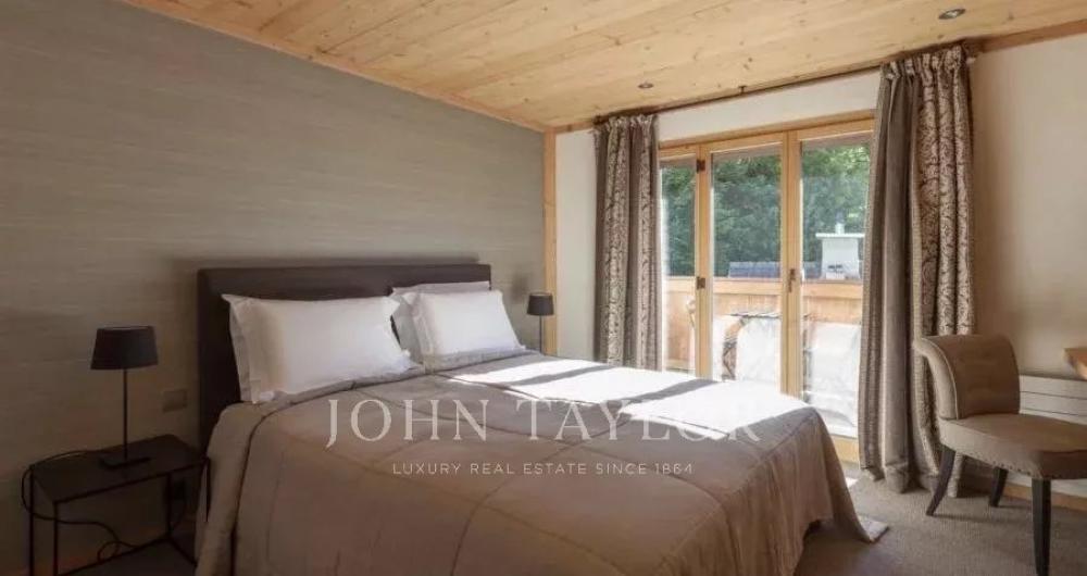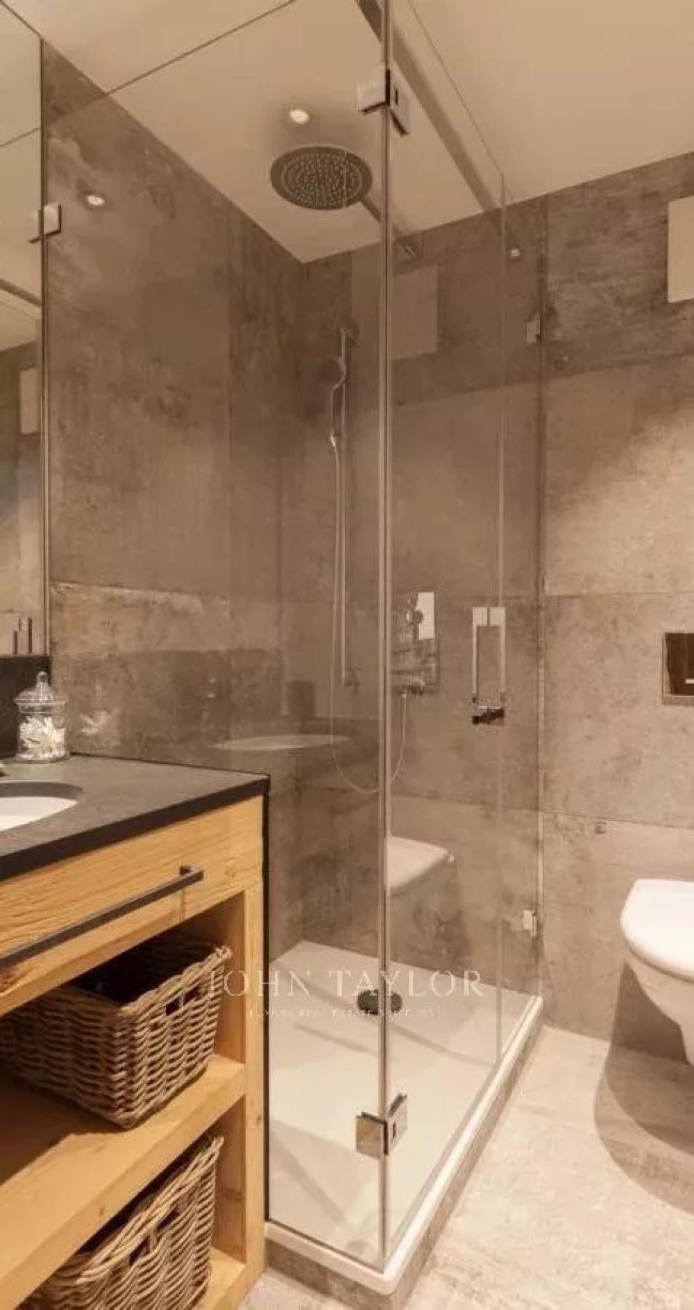 The open plan living area is spacious and comfortable. Cleverly exposed beams, sensitive design and plush furnishings creates a wonderful homely atmosphere. Large sofas surround the grand stone fireplace whilst neutral colours flow throughout this chalet style apartment.