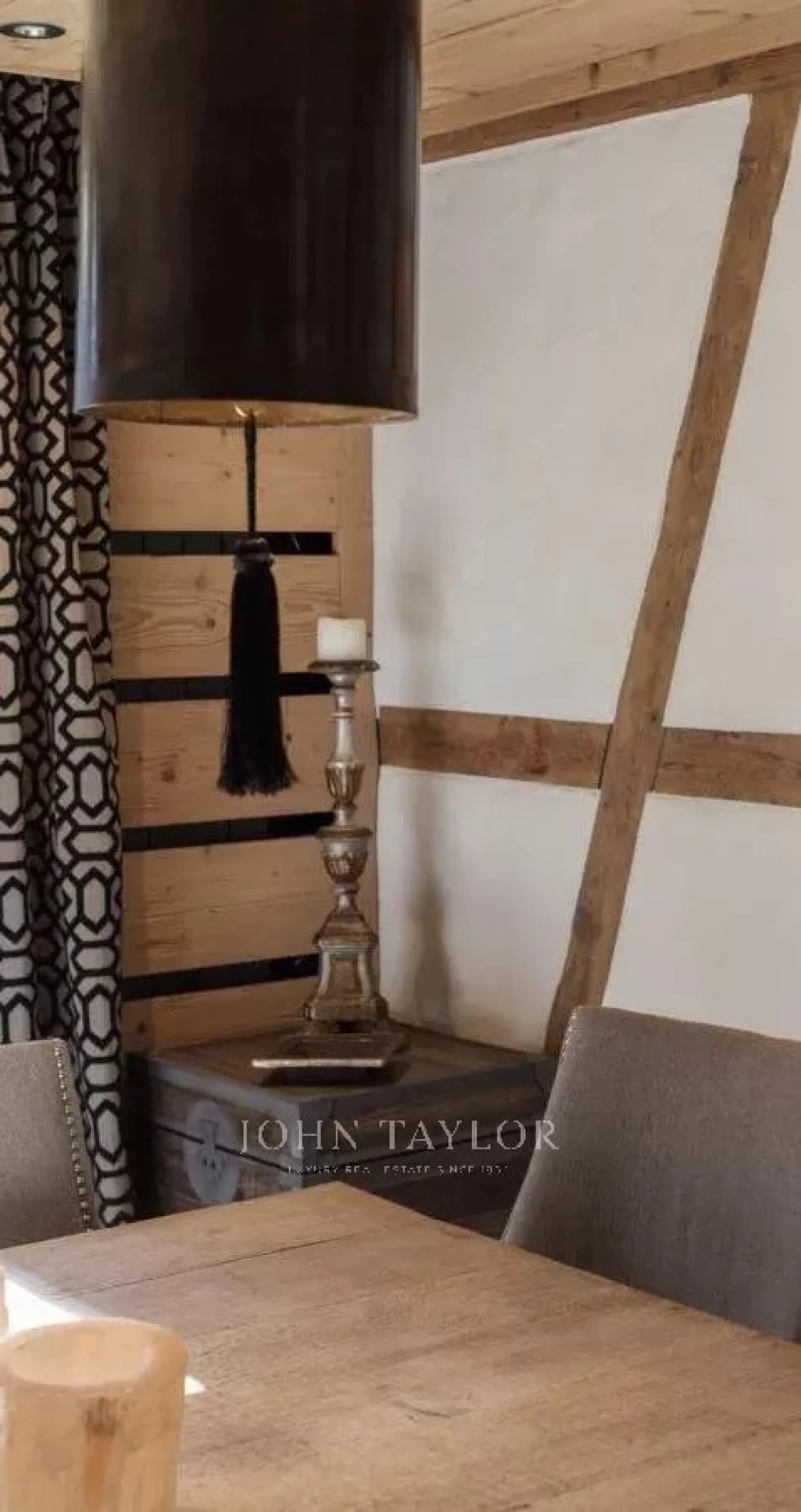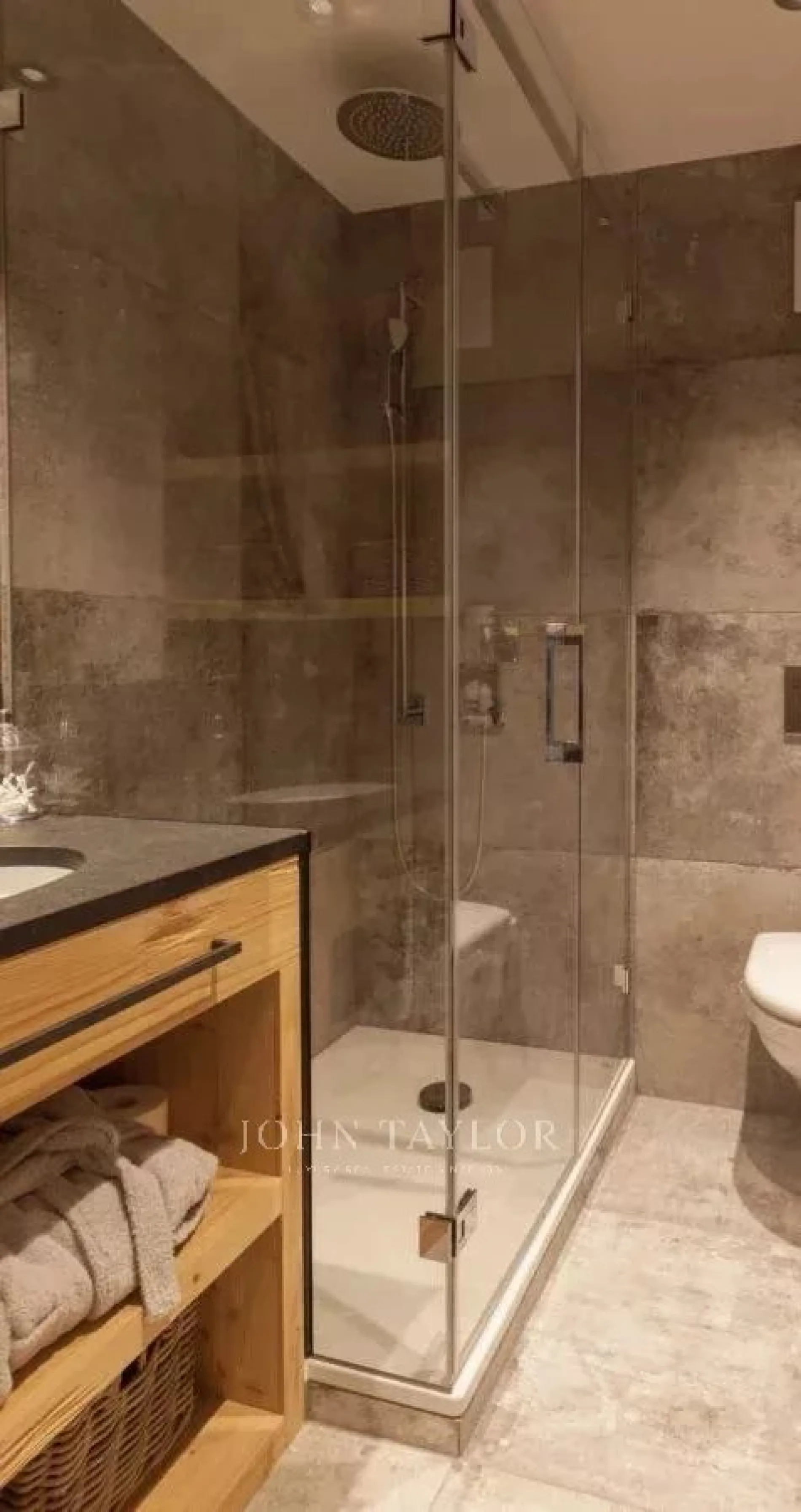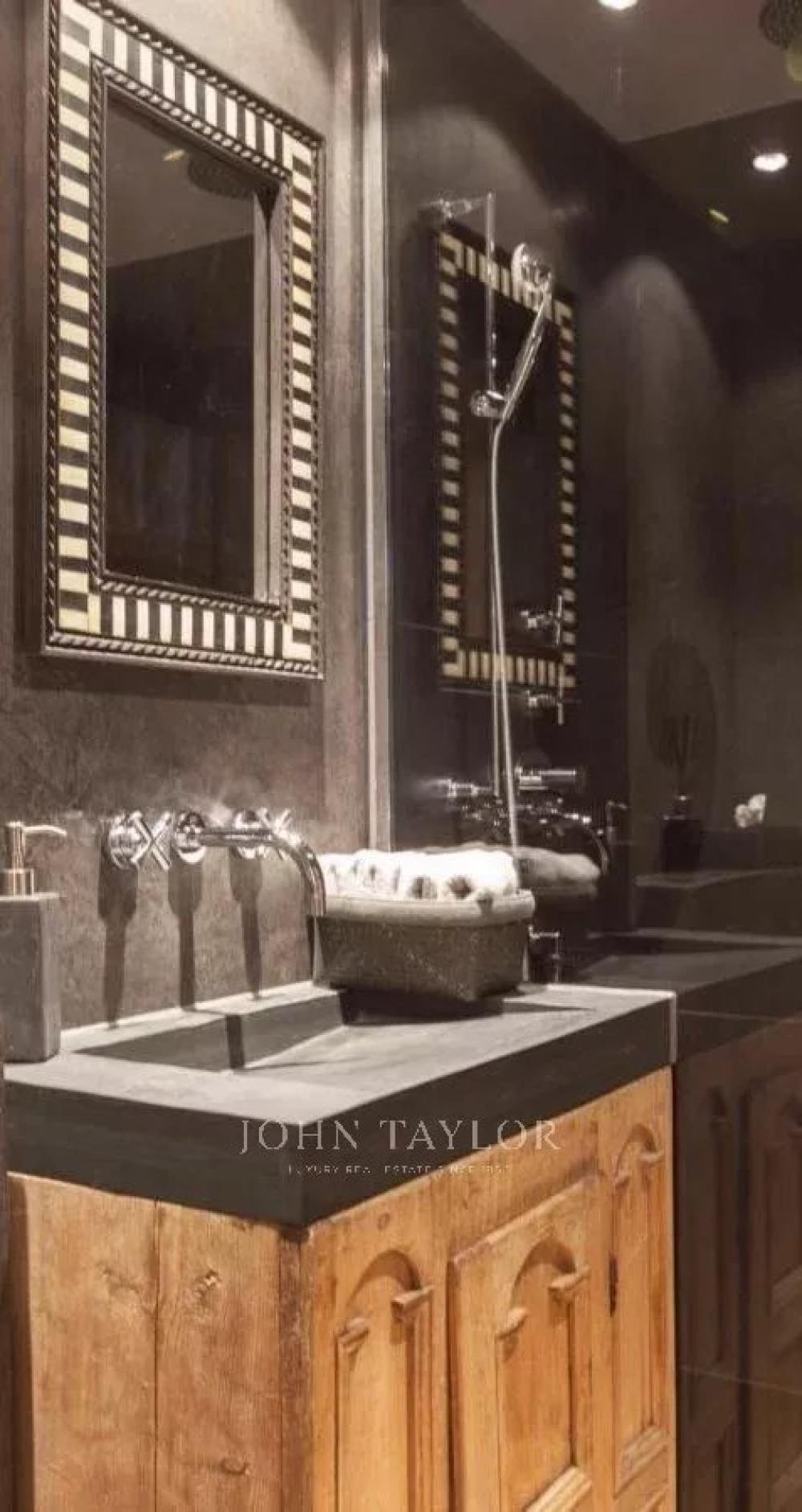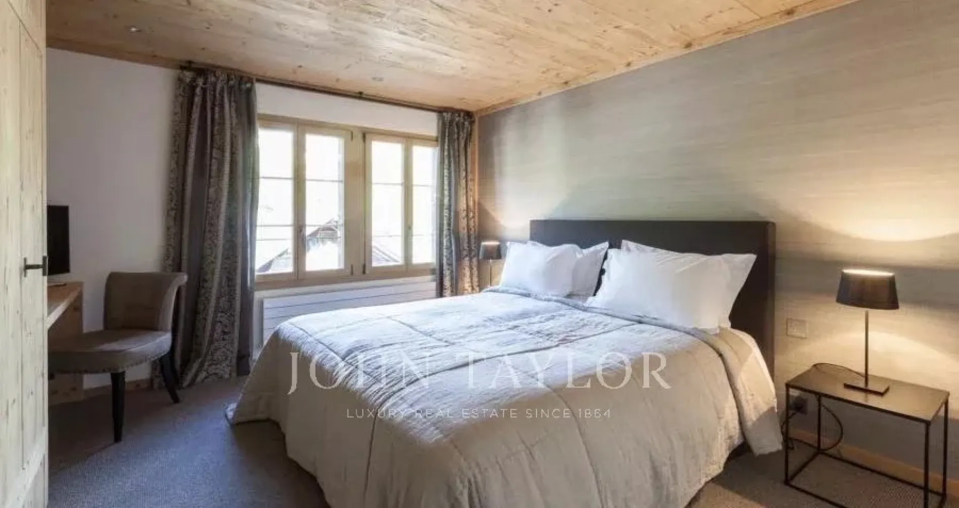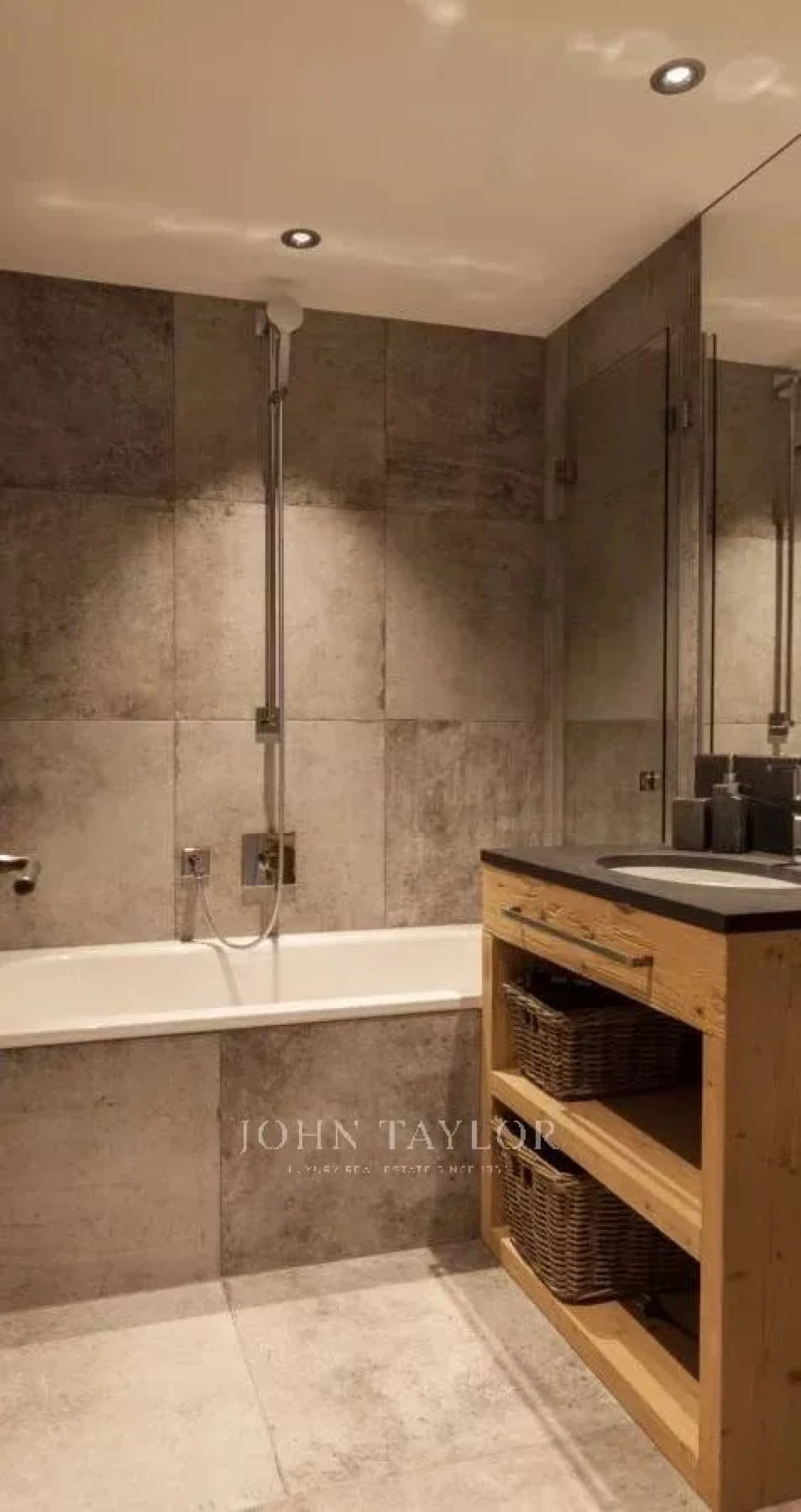 The open plan living area is spacious and comfortable. Cleverly exposed beams, sensitive design and plush furnishings creates a wonderful homely atmosphere. Large sofas surround the grand stone fireplace whilst neutral colours flow throughout this chalet style apartment.