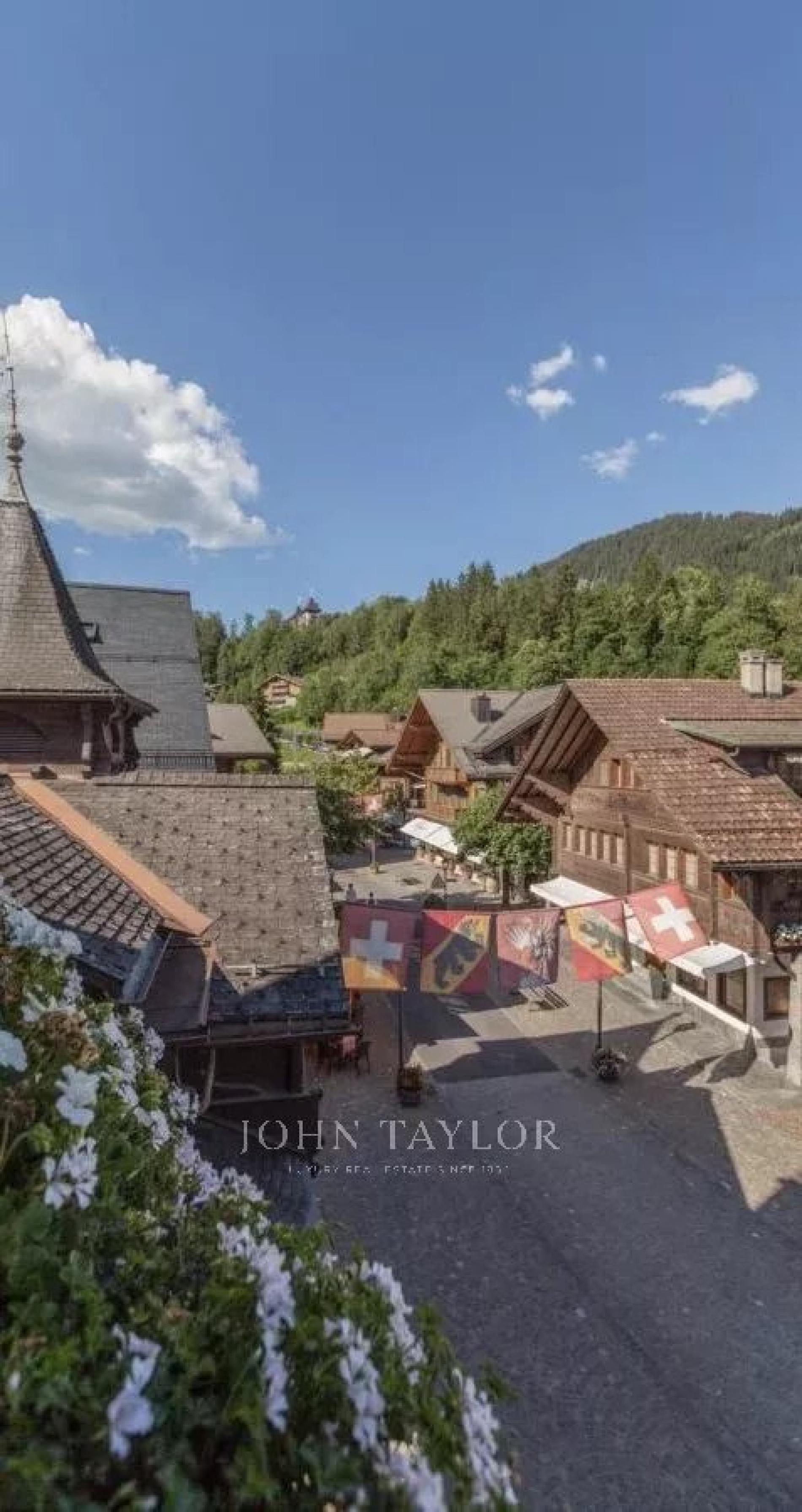The apartment spreads over 3 floors, and affords wonderful views over the roof tops of the Gstaad village and across to the renowned Gstaad Palace.