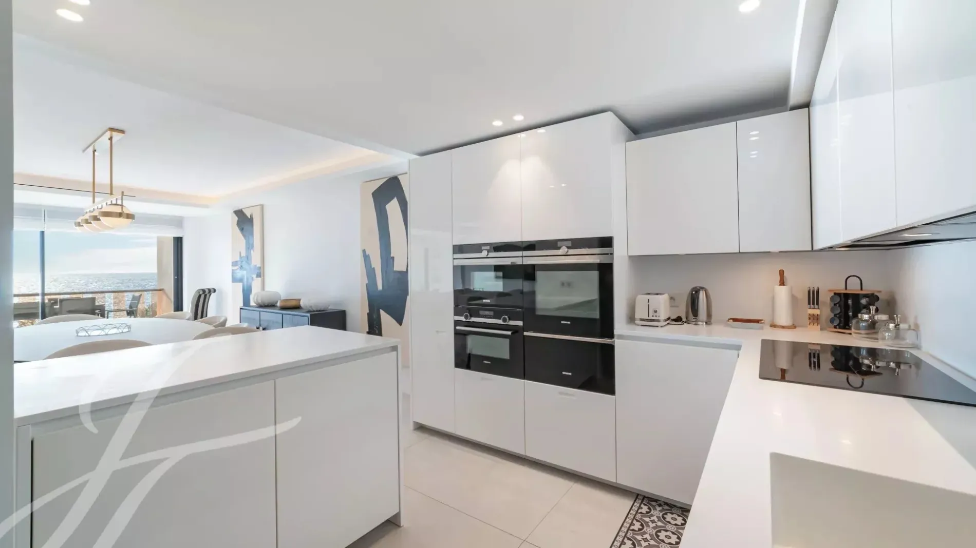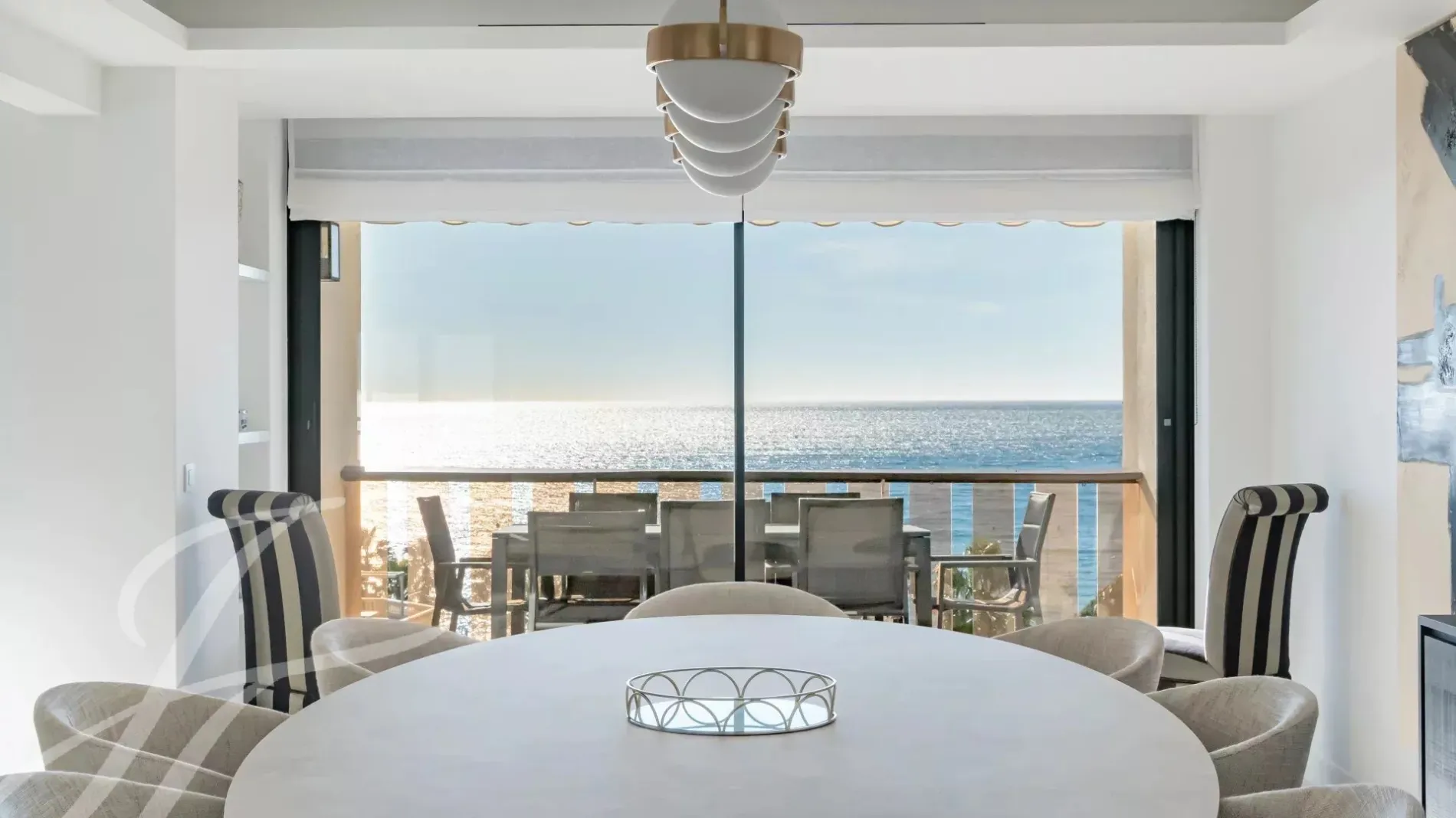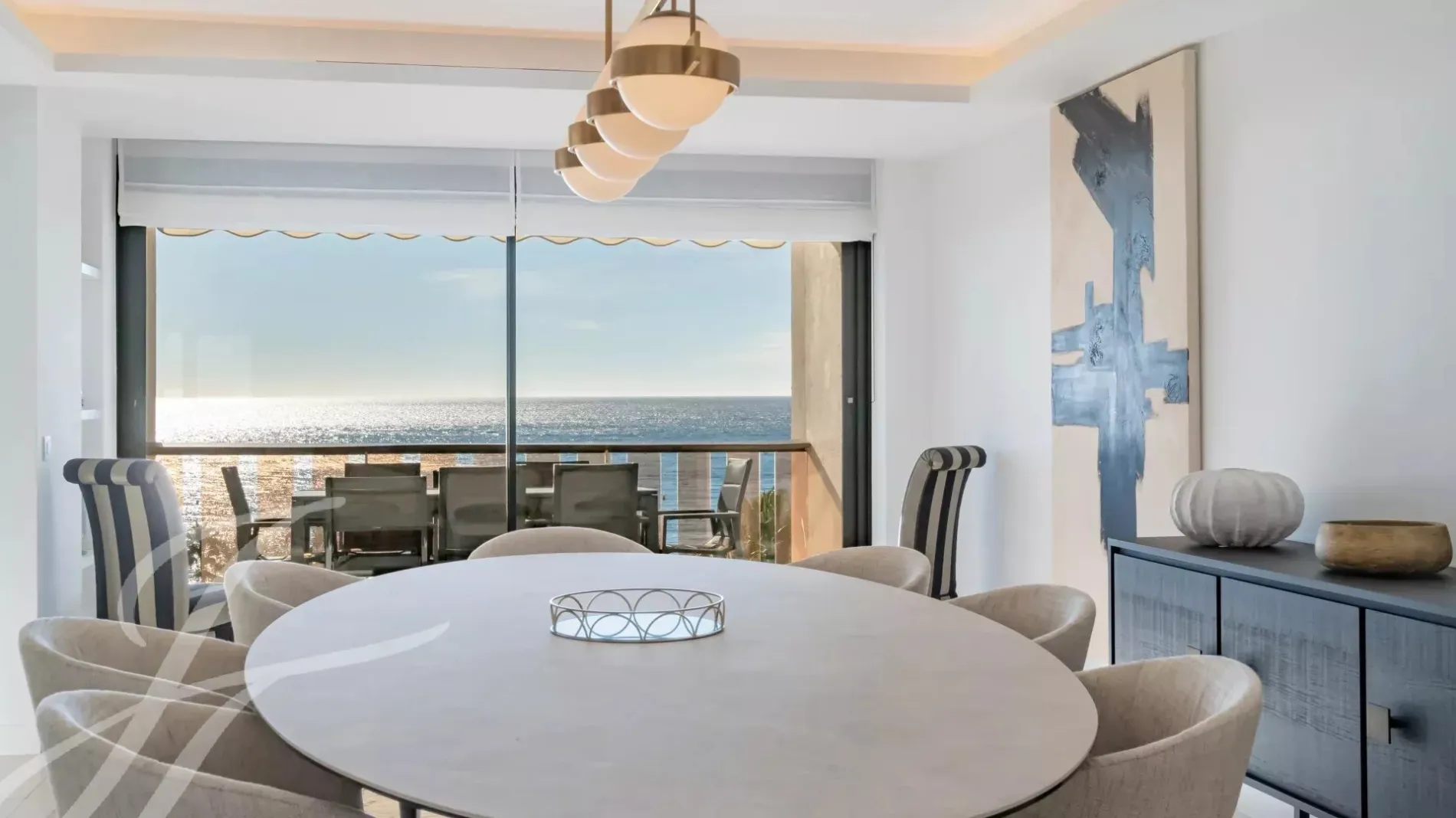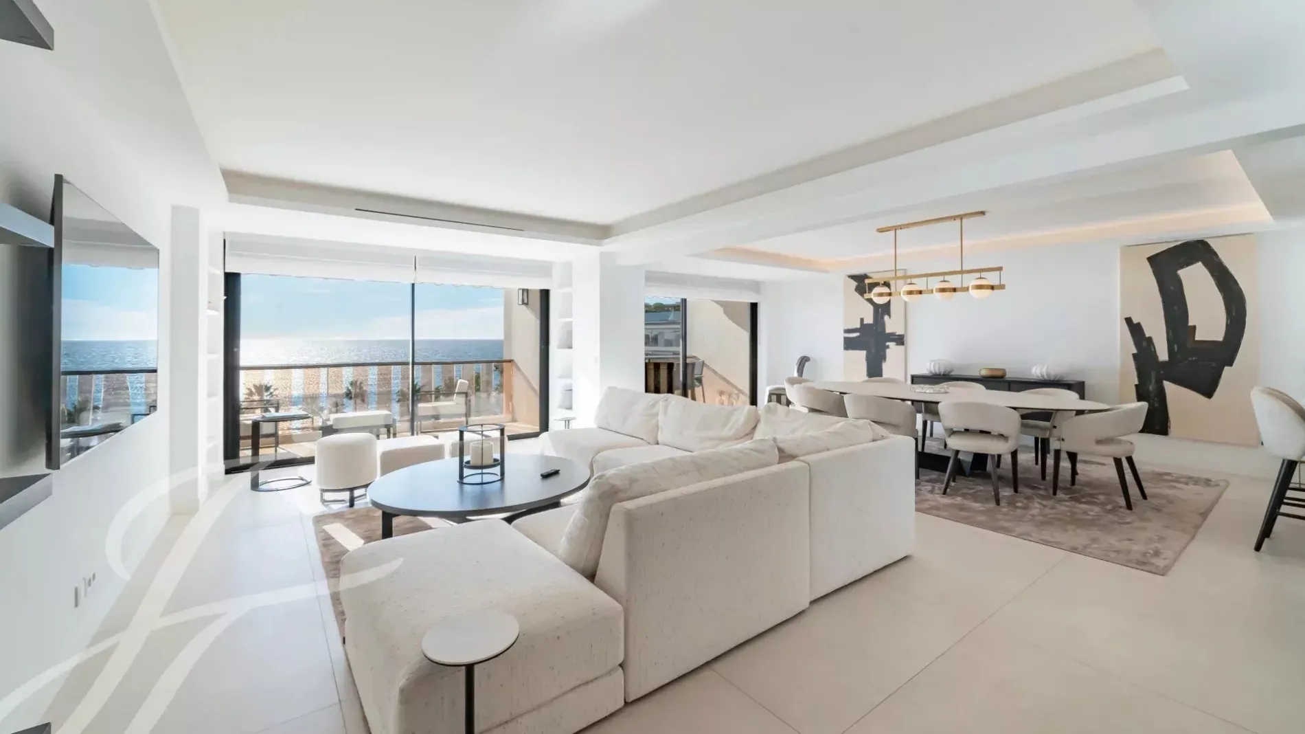 Spacious, bright living and dining room opening onto a sunny terrace with sea views