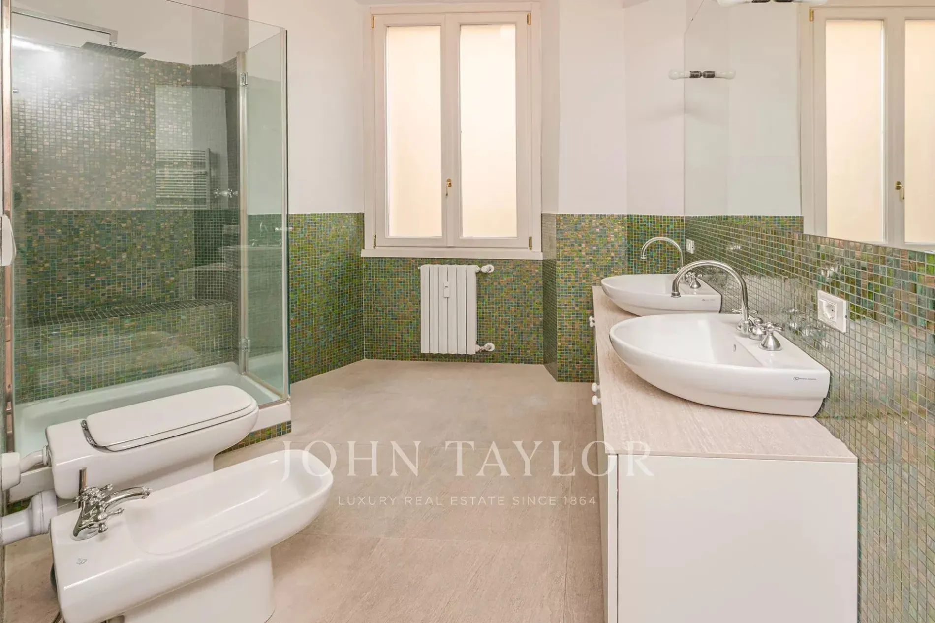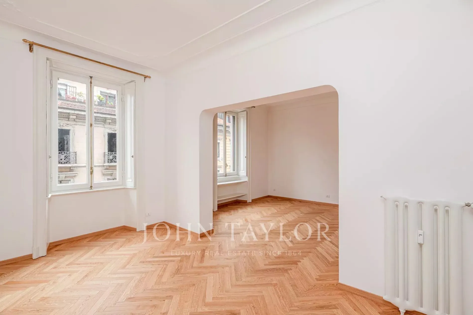 The property is very bright and quiet, located on a high floor of a prestigious historic building, equipped with full-day security and concierge service. Residence of approx. 110 sqm, an apartment of great charm, featuring a large entrance hall, splendid and spacious double living room, large eat-in kitchen with elegant new custom-made furnishings, 2 bedrooms, 2 bathrooms. Balcony. This splendid home, recently renovated, stands out for its precious period finishes and its views. The apartment is available fully renovated and partially furnished with custom-made furniture, with the possibility to furnish the interiors according to personal taste and needs. This property represents a unique opportunity in a privileged location, perfect for those seeking an elegant home in the oldest and most residential neighborhood of Milan.
