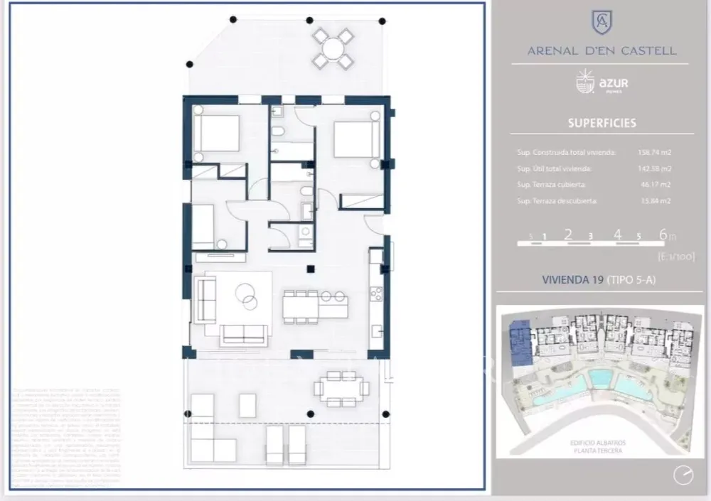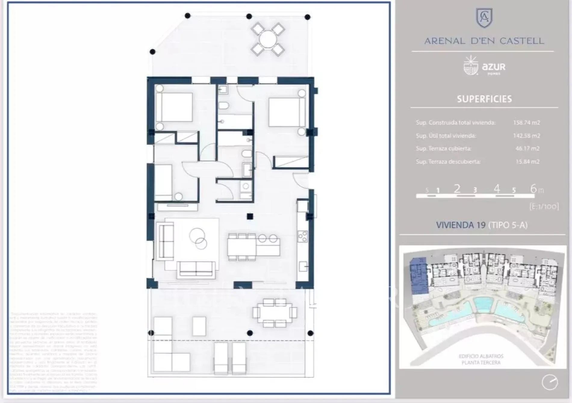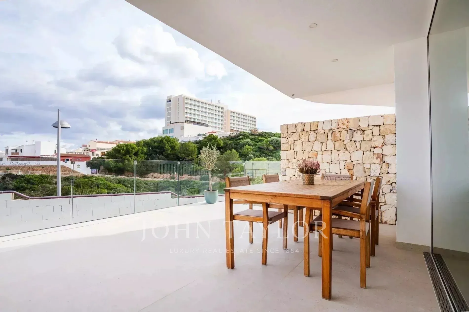 If you are looking for stunning sea views and a modern and luxurious apartment, this property could be a golden opportunity. Here you will live just 200 meters from the beach of S'Arenal d'en Castell, with all the necessary amenities for year-round wellness. You will find 1, 2 or 3 bedroom apartments with spacious terraces ranging from 100 to 260 square meters. The living space is generous and extremely bright, allowing you to enjoy the wonderful surroundings from your sofa. After enjoying the interior spaces, you will have access to common areas that include a children's play area, a coworking space, a swimming pool, a gym and a spa. The property has a parking space and a storage room.
