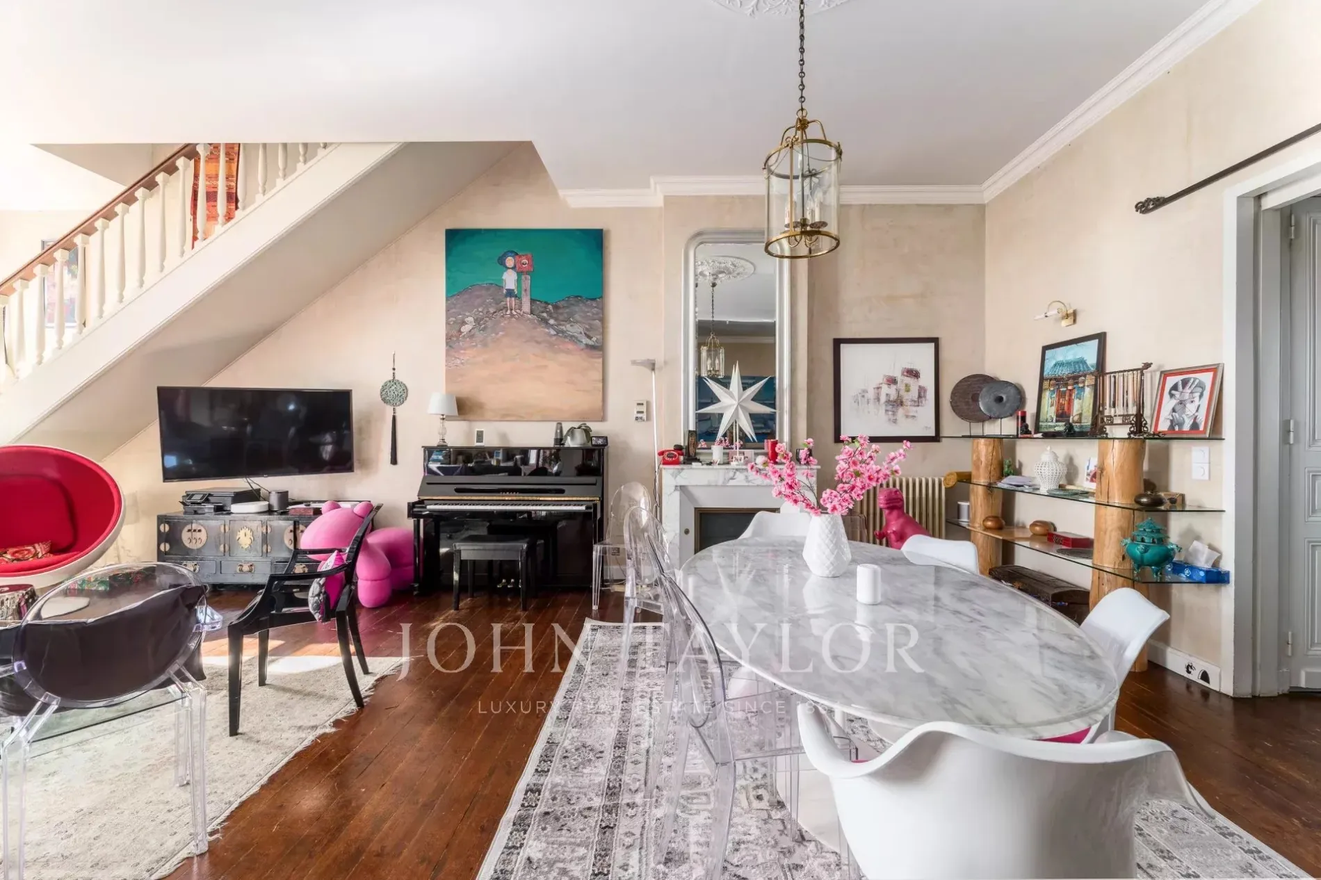 The apartment is equipped with state-of-the-art security systems, such as an intercom and videophone, providing both convenience and peace of mind. The design seamlessly blends classic charm with contemporary touches, creating an inviting and sophisticated environment. The living area is enhanced by ample natural light and vibrant decor.