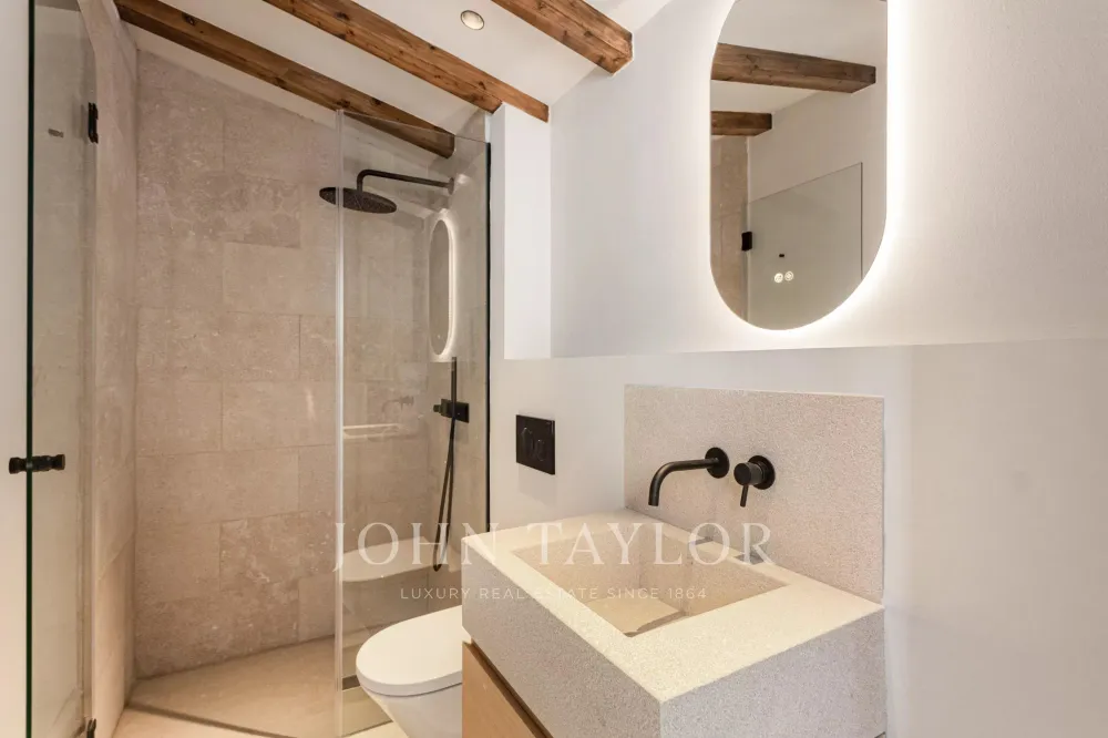 The upper level offers a versatile additional space, perfectly suited as a guest suite, home office, study, or private library, complete with its own en suite bathroom. From here, you access a superb 13 m² private rooftop terrace, an exceptional feature in Palma Old Town, ideal for enjoying the Mediterranean climate, al fresco dining, or relaxing in total privacy above the city rooftops.