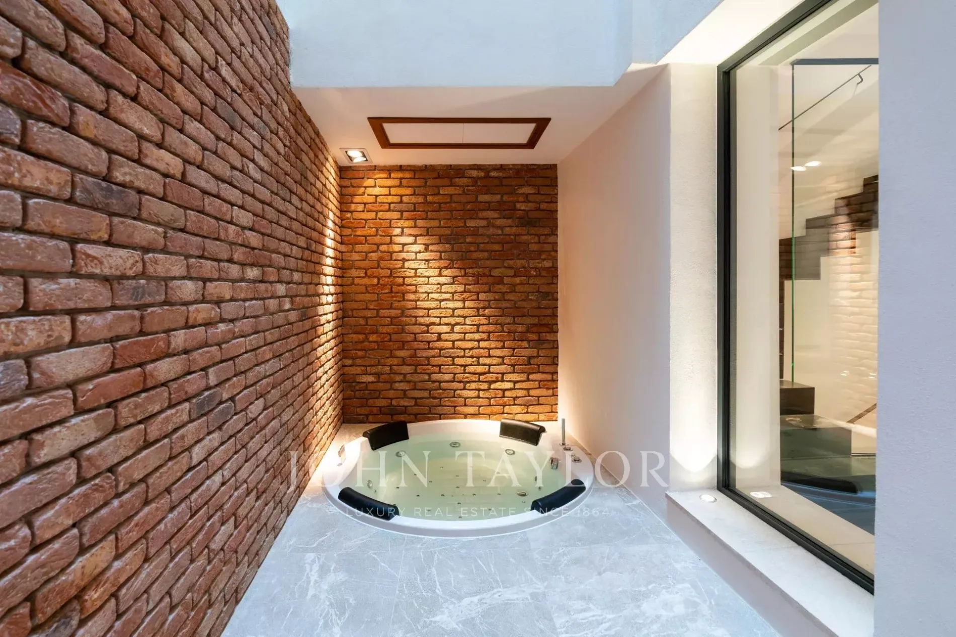 On the ground floor, the heart of the home unfolds in an open-plan living and dining area, anchored by a state-of-the-art designer kitchen with bar counter – a perfect setting for entertaining in style. A dramatic glass wall framed in black iron opens onto a private patio with a whirlpool tub, where indoor meets outdoor seamlessly.