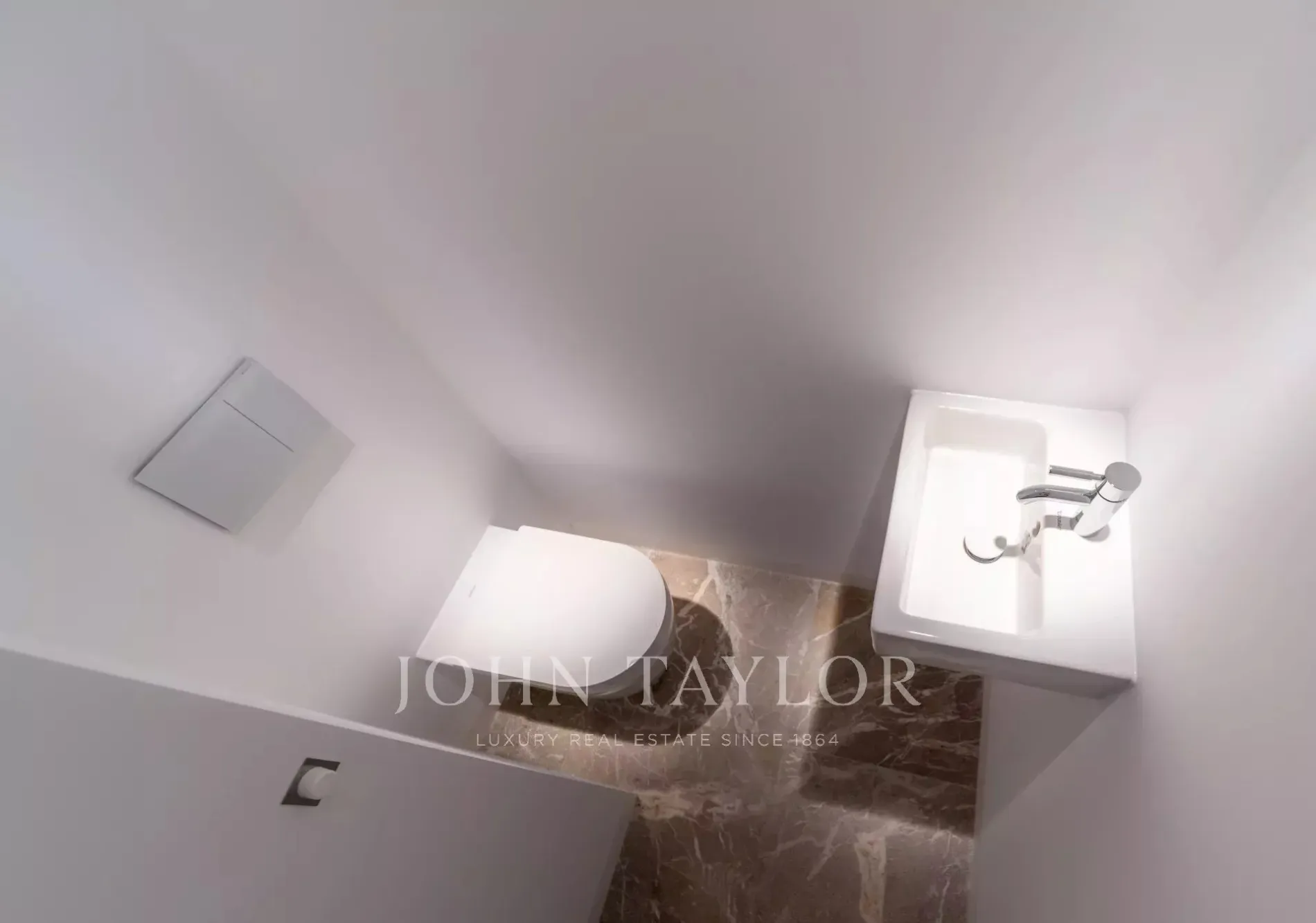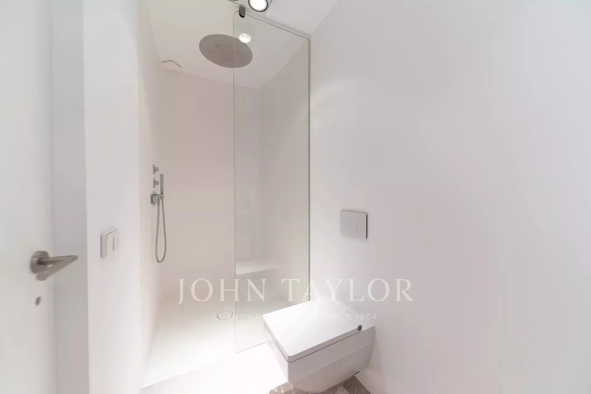 A striking black iron staircase, enclosed by glass balustrades, leads to the upper level, where two generous bedrooms with en-suite bathrooms await. Elegant herringbone wooden floors and bespoke built-in cabinetry combine authentic charm with contemporary sophistication.