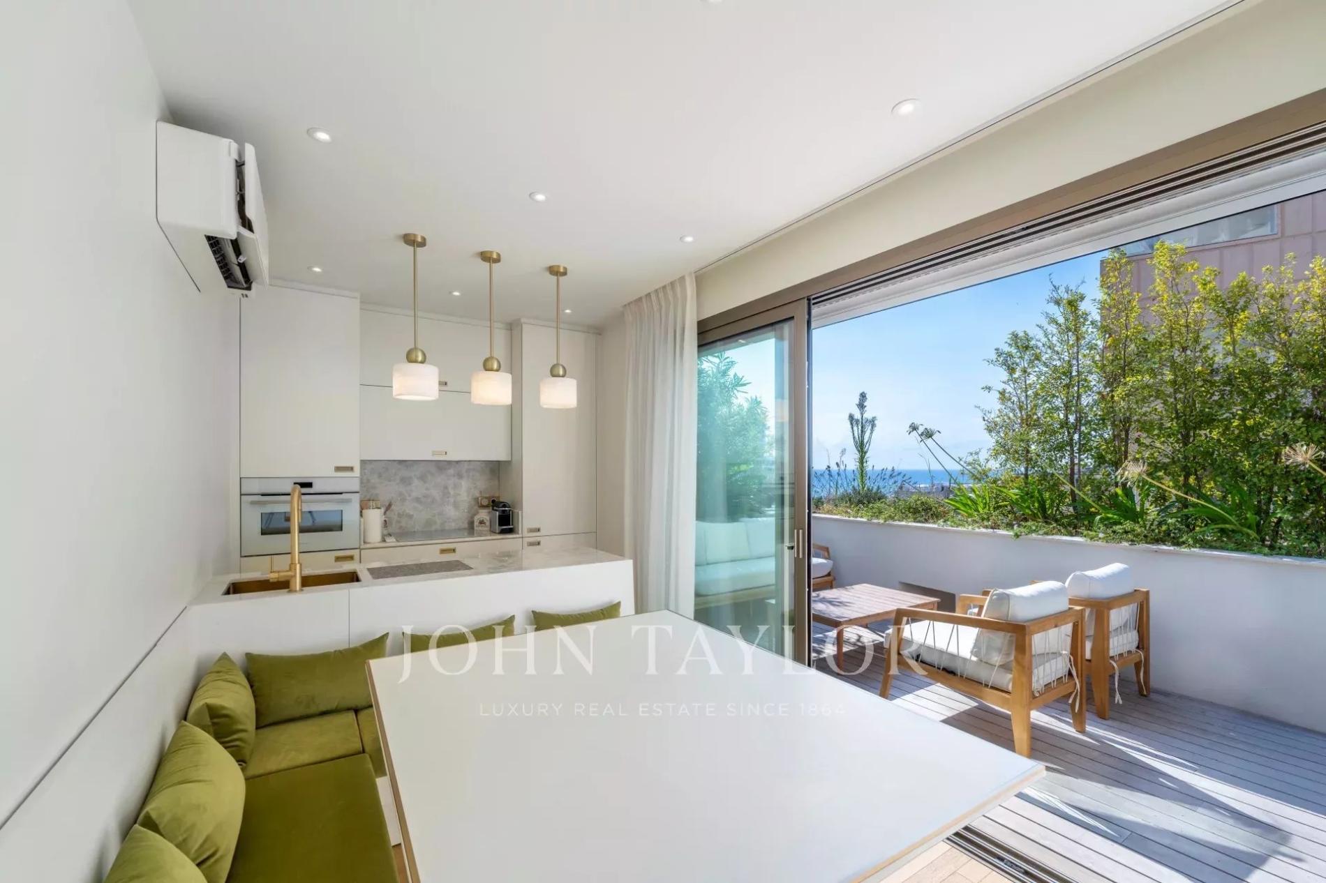 A bright south-east facing living room with sea and Mareterra views.