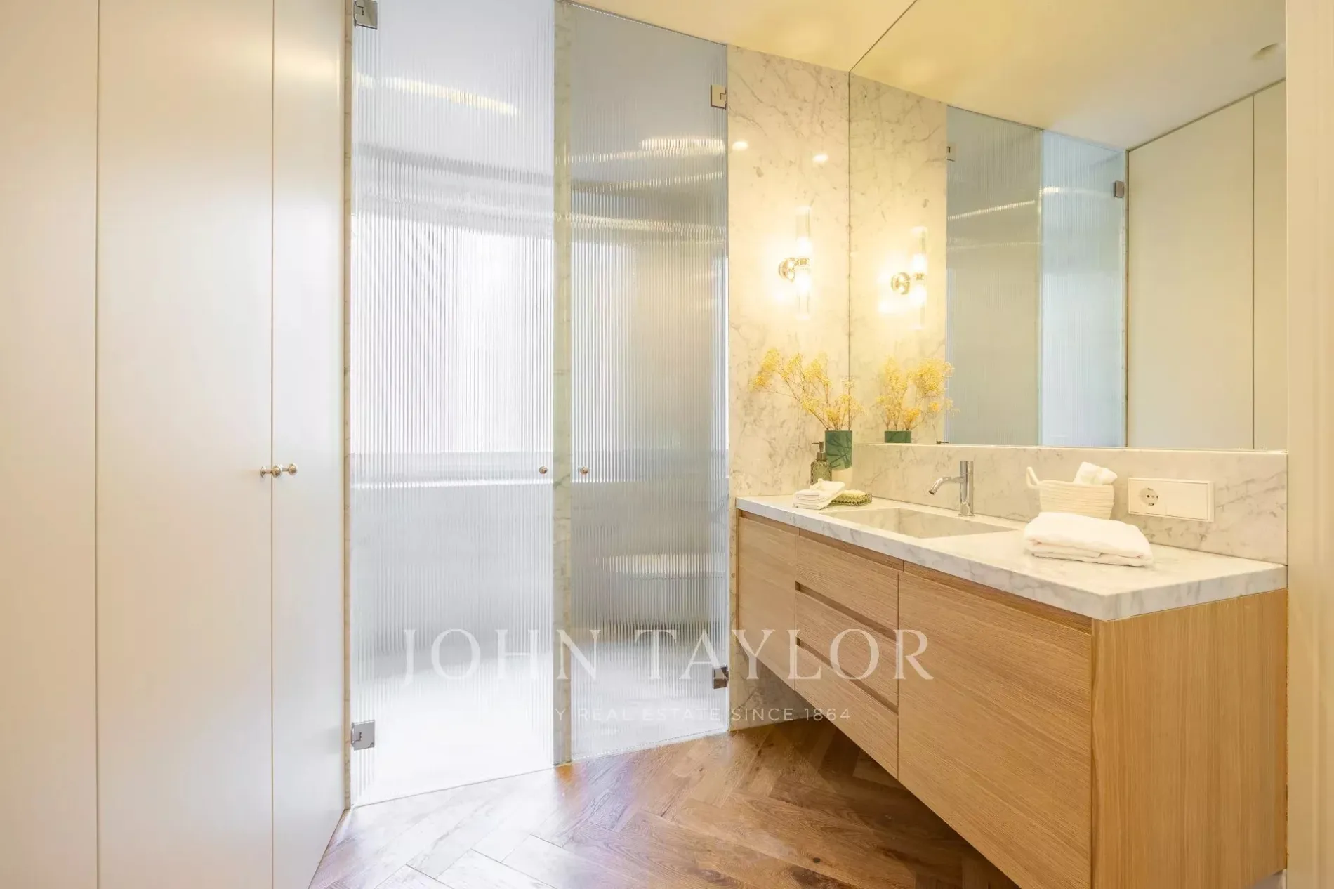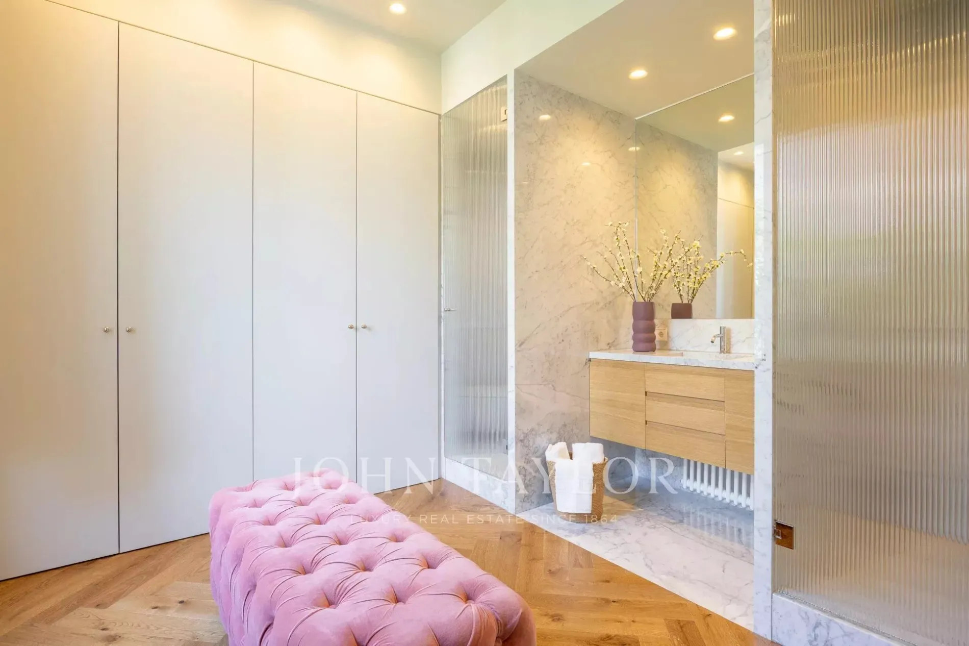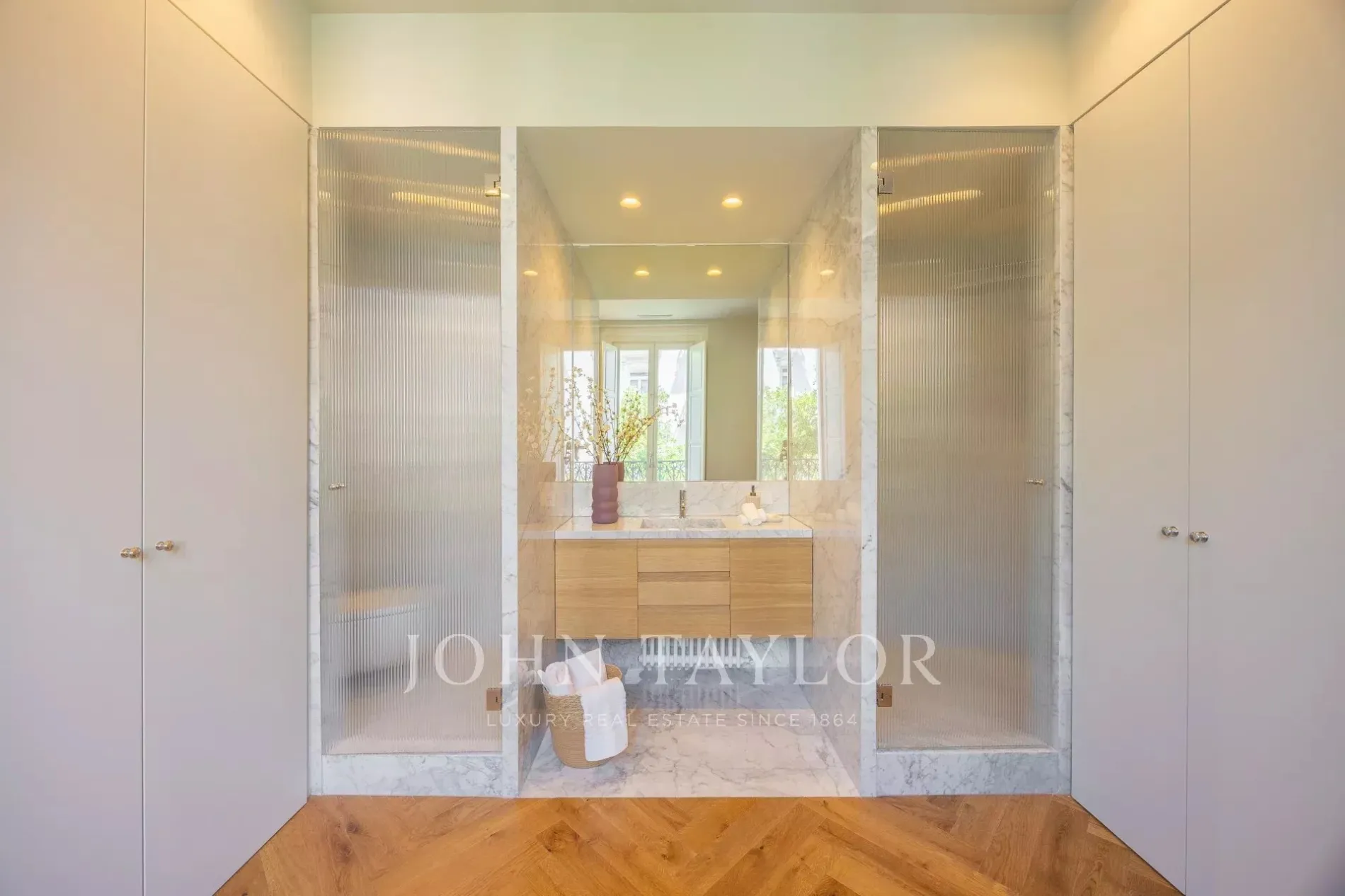 The night area is composed of four bedrooms and four bathrooms: The master suite has four balconies that bathe the bedroom and bathroom in light. A second suite with its own bathroom/dressing room and two other bedrooms sharing a family bathroom. A guest toilet, a large service area with bedroom and bathroom for domestic service, as well as a large laundry area complete the complex. It also has a magnificent kitchen with central island with direct access to the dining room.