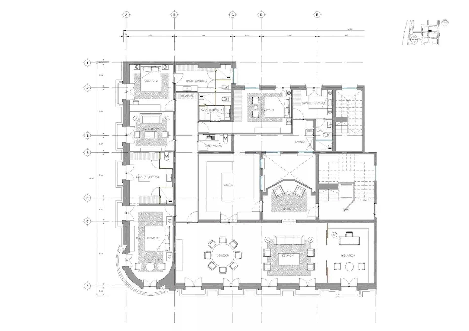 We access the house through a welcoming hall, elegant and bright, with a stained glass window from the early twentieth century that leads to an extraordinary living / dining room and adjoining library, with 5 balconies facing south.