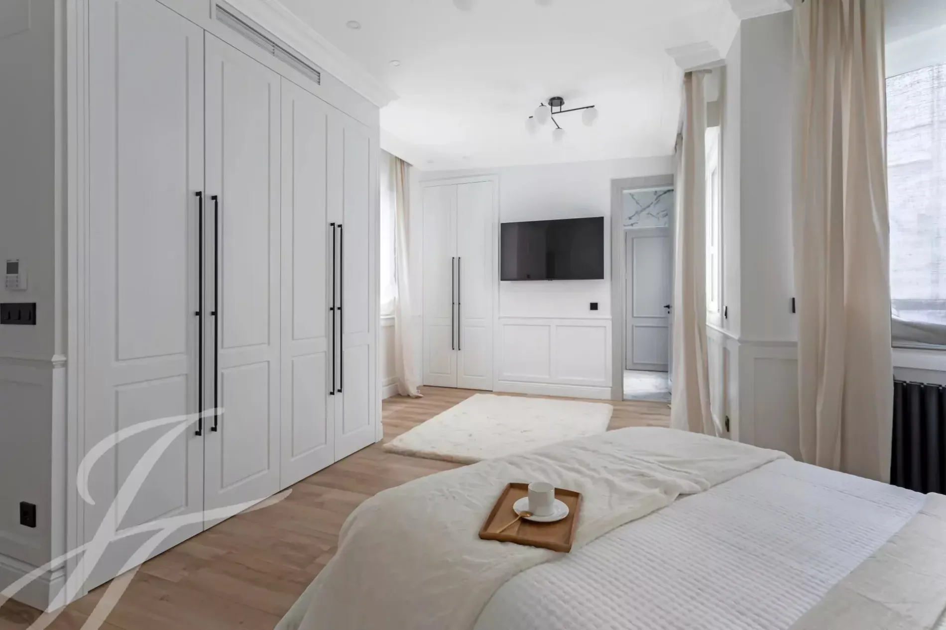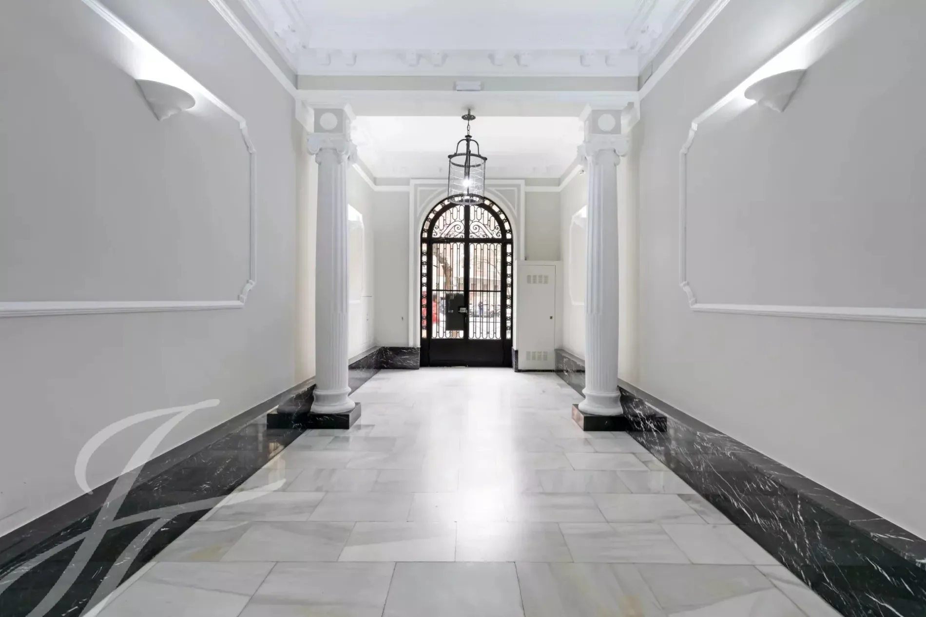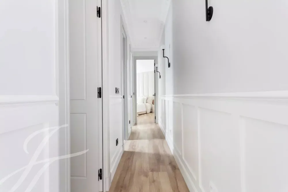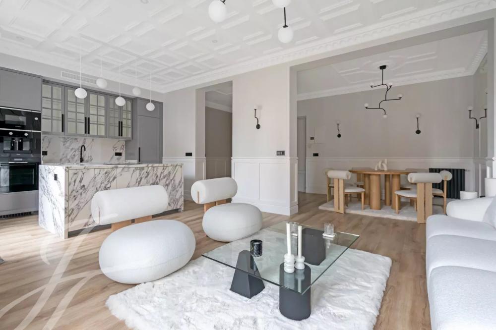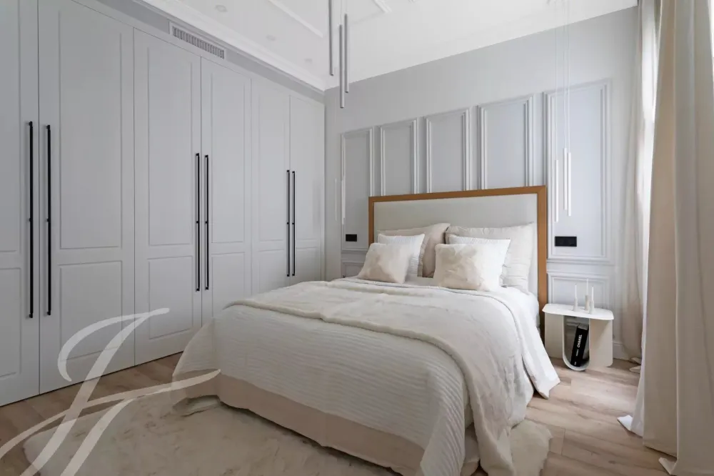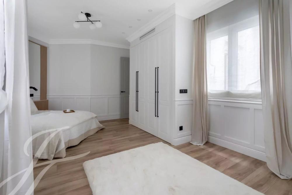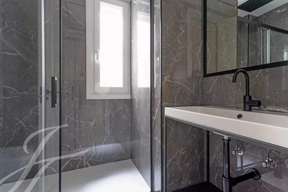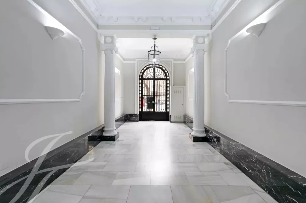 A newly renovated apartment located on the fifth floor of a beautiful building with a classic facade.