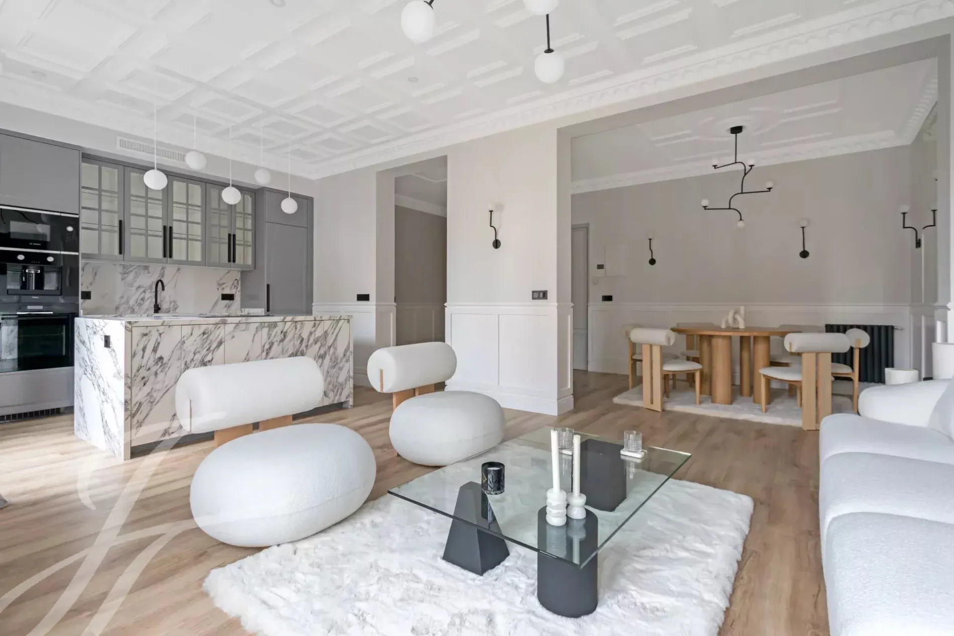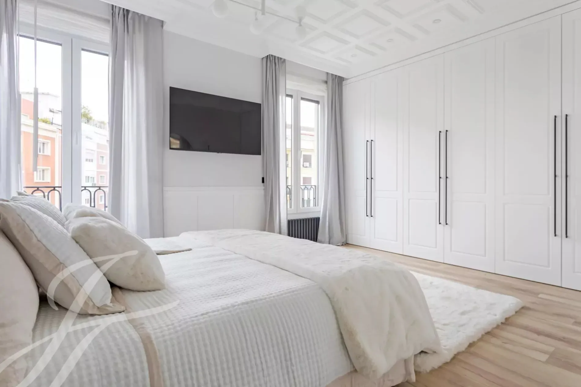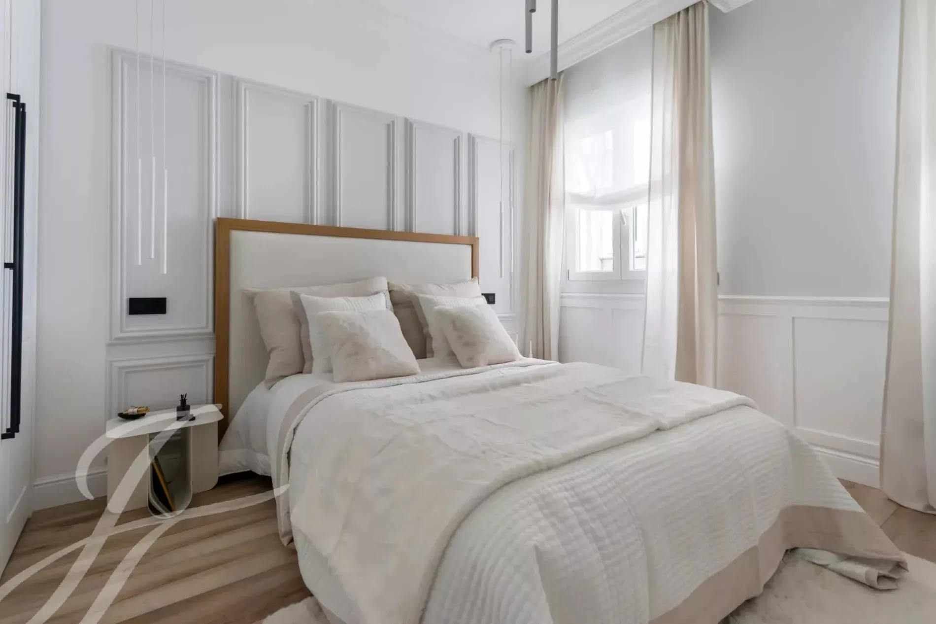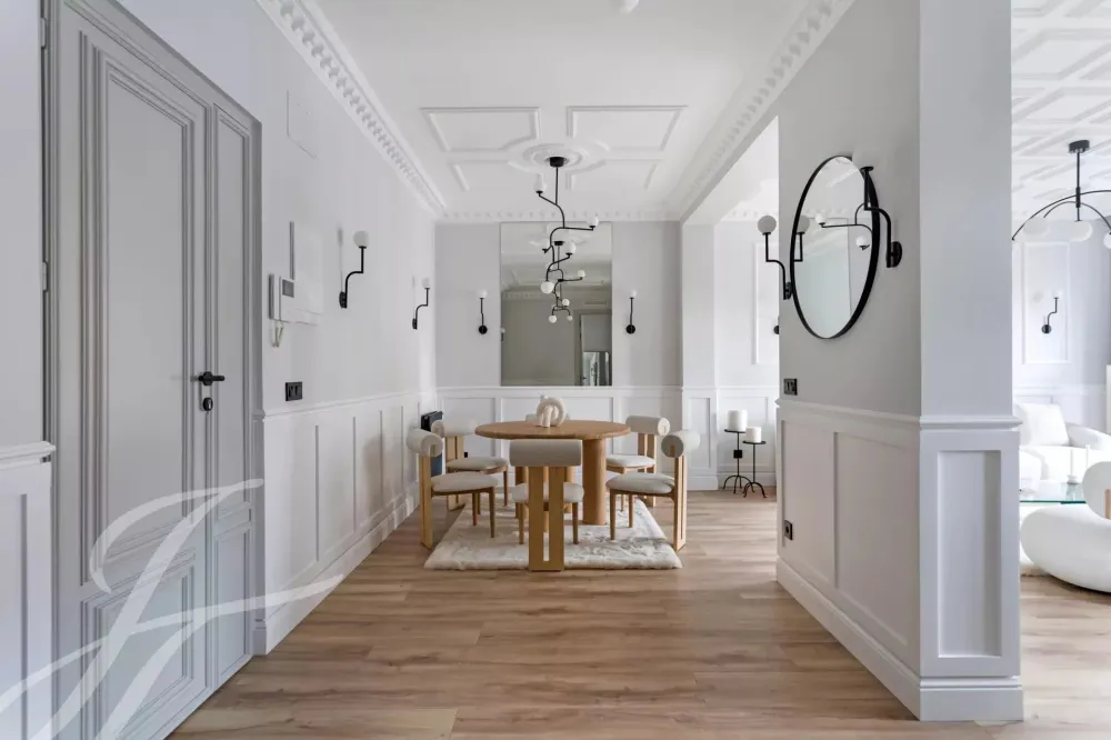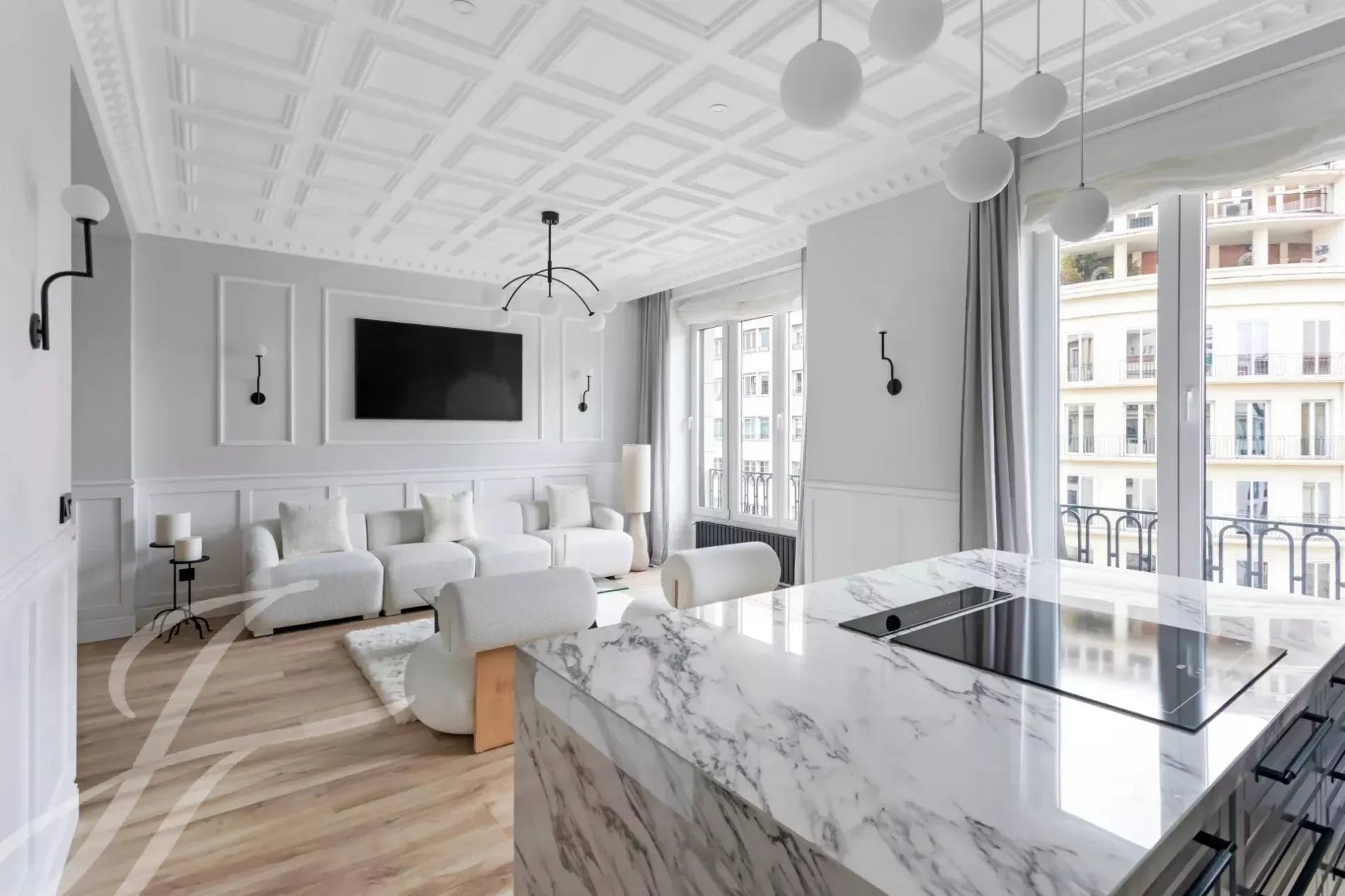 A newly renovated apartment located on the fifth floor of a beautiful building with a classic facade.