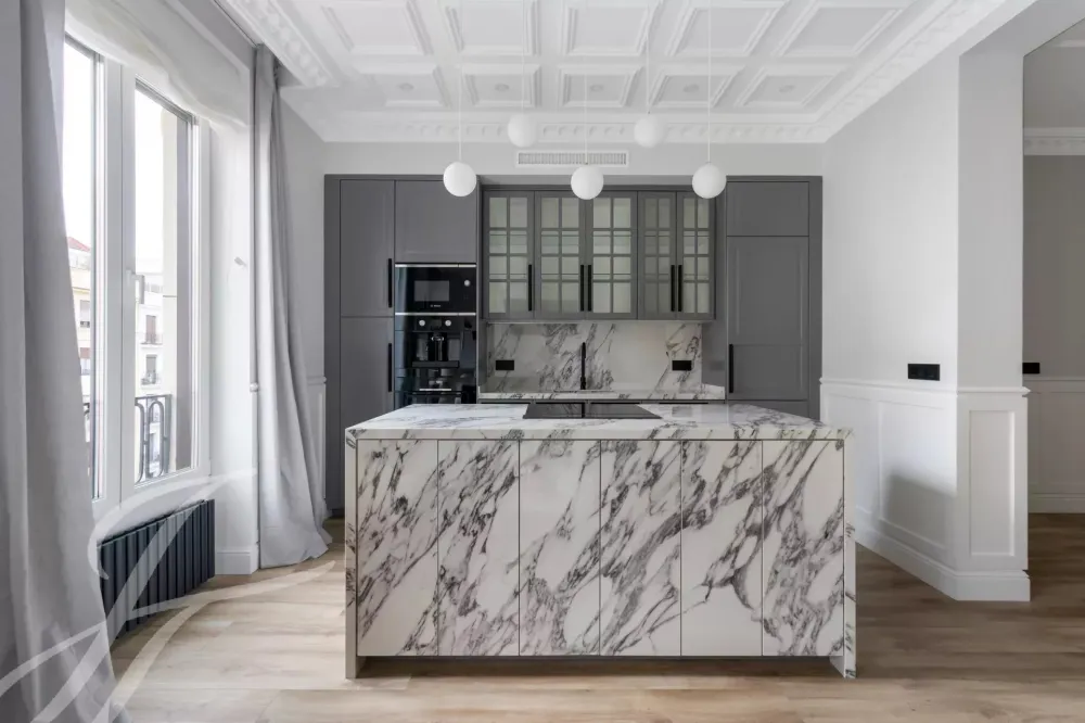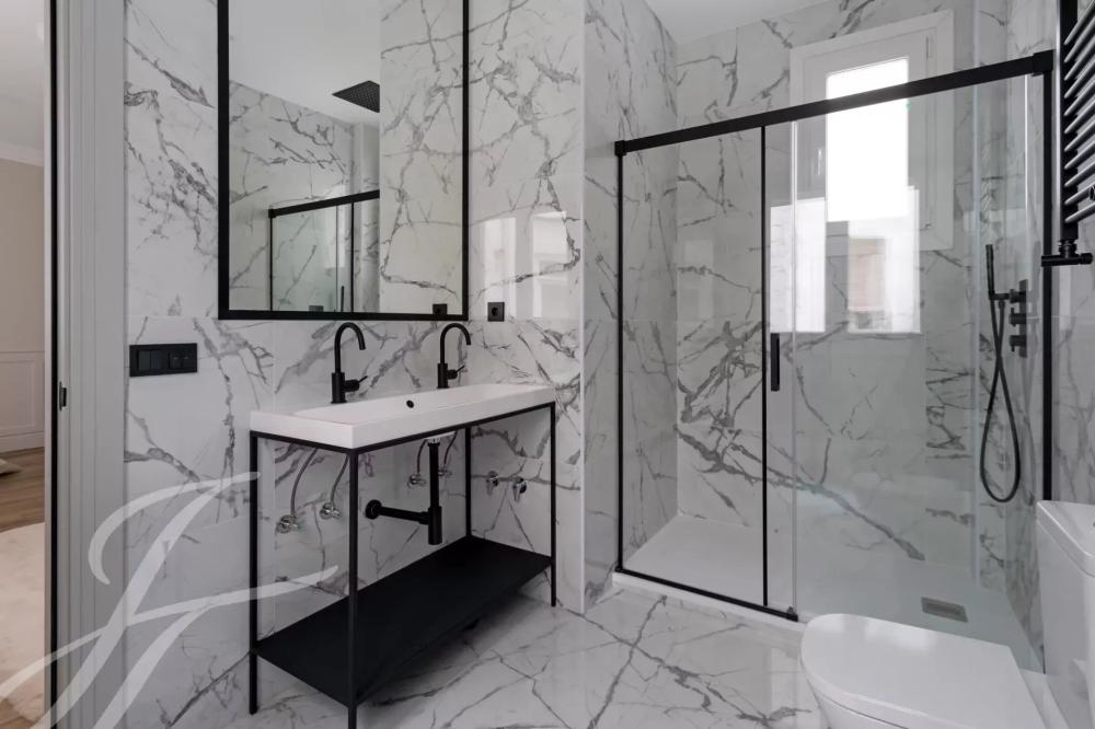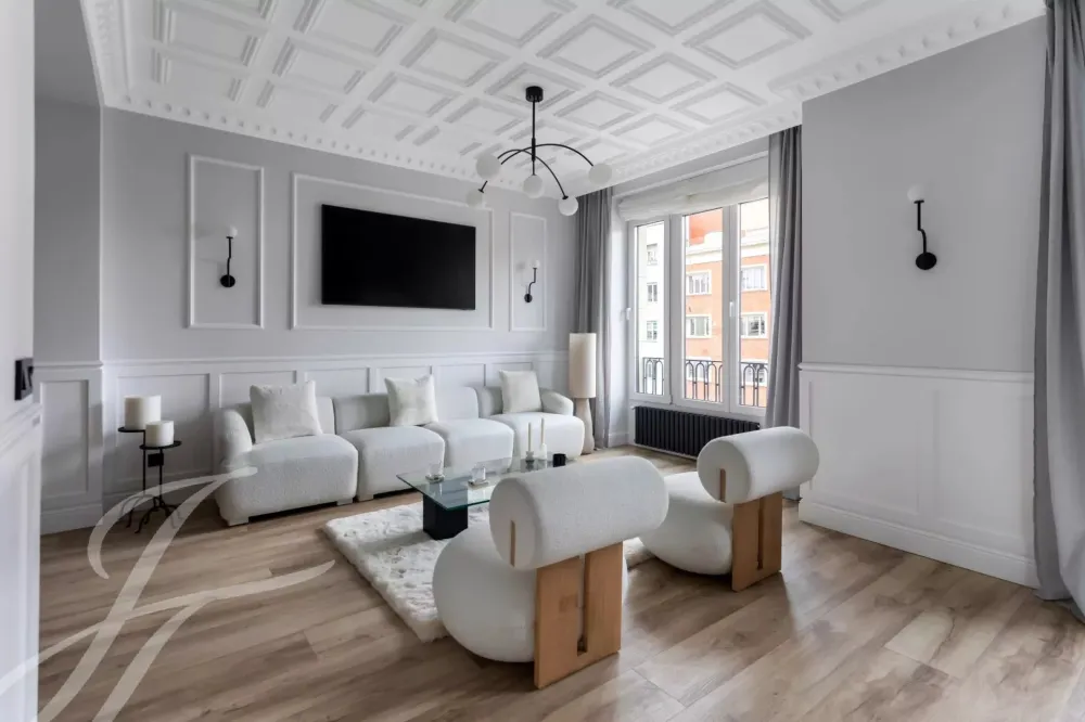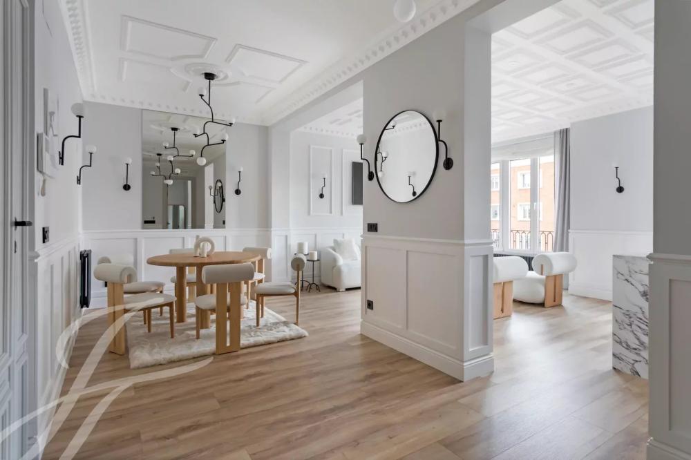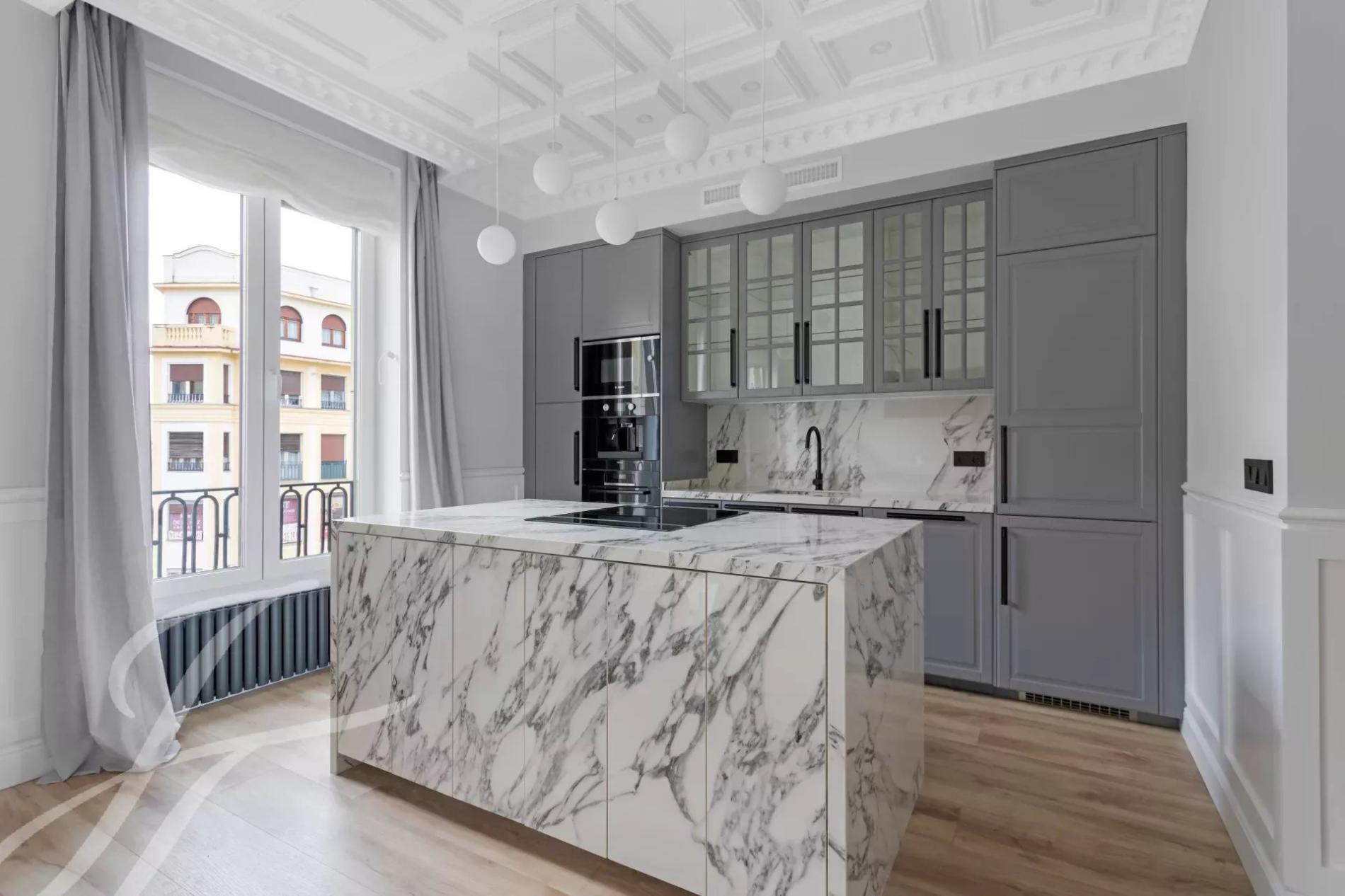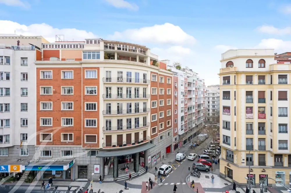 The exterior area is occupied by the large living room with balconies overlooking Alcalá street, with the modern style kitchen, a large island and equipped with high-end appliances.