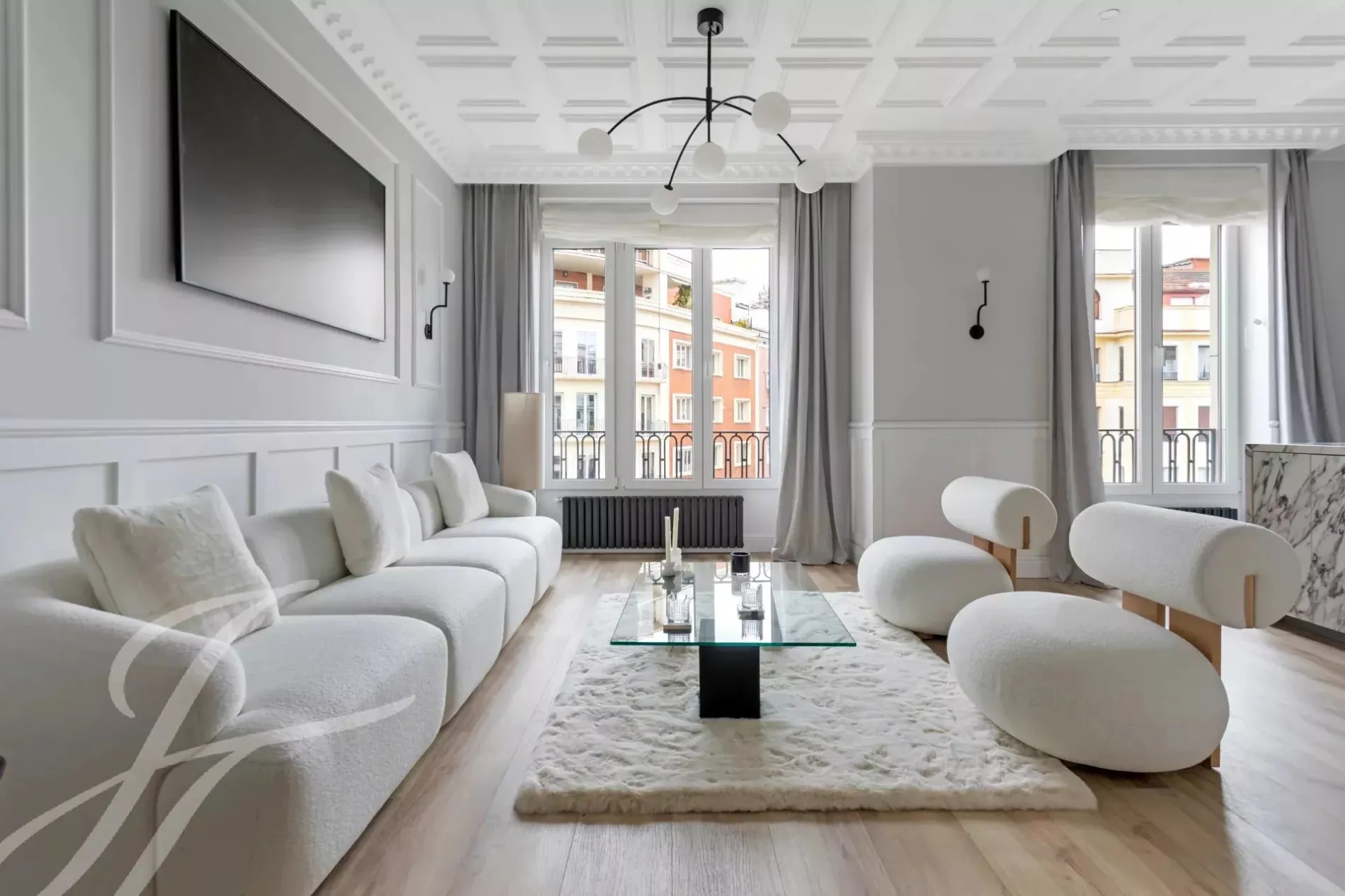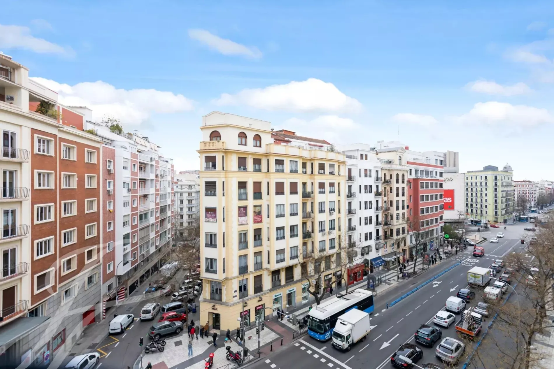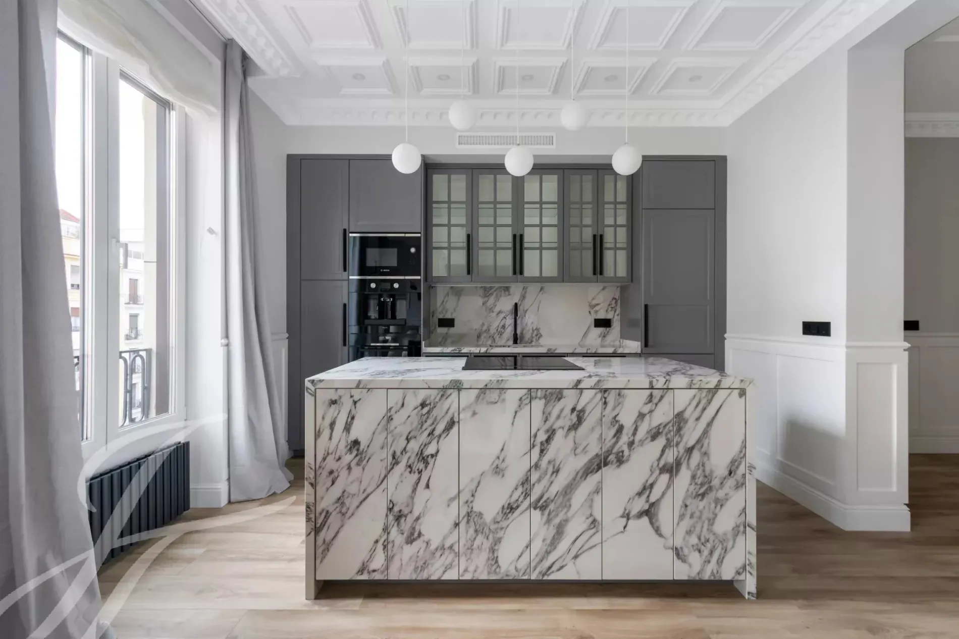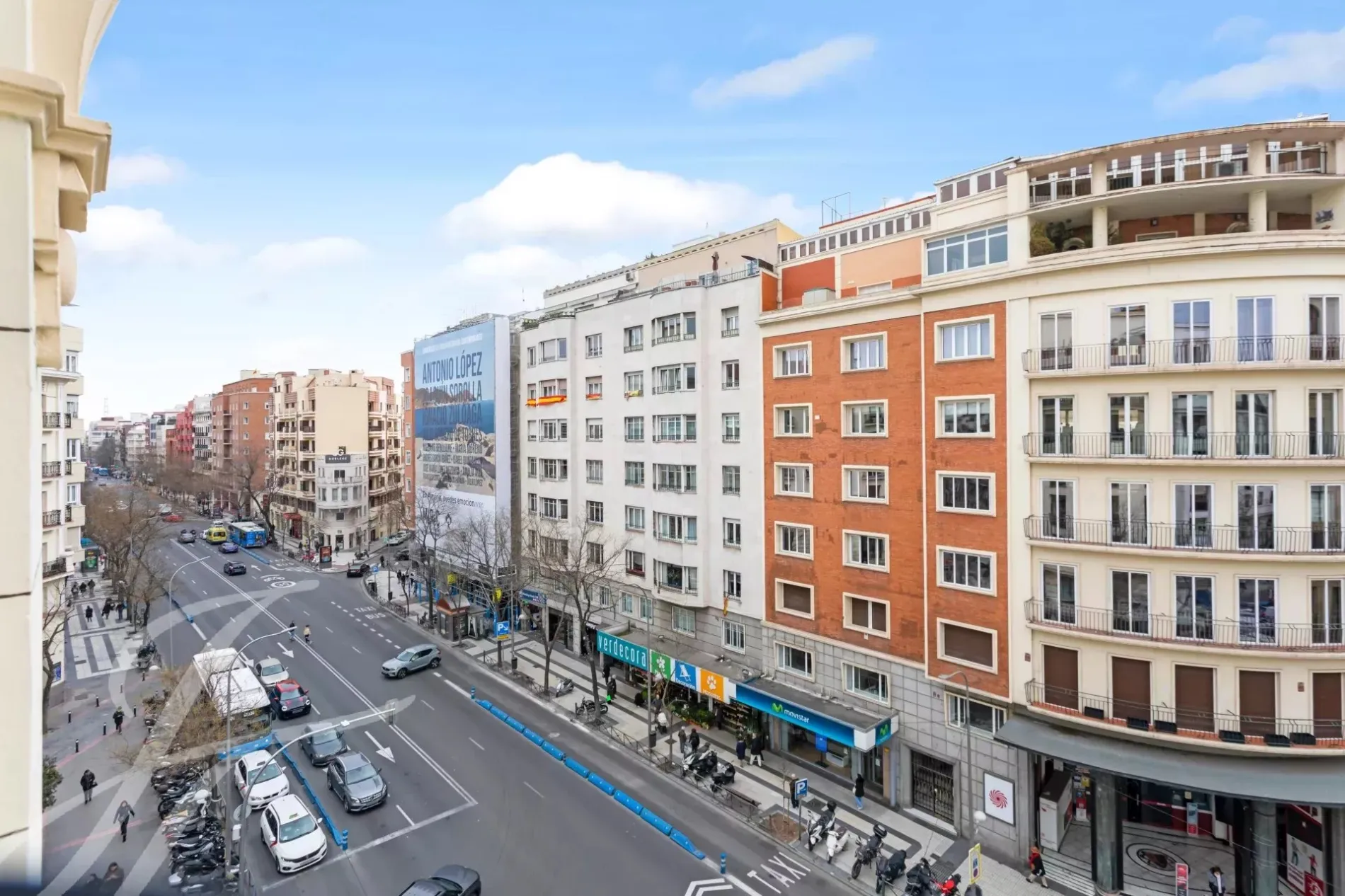 The exterior area is occupied by the large living room with balconies overlooking Alcalá street, with the modern style kitchen, a large island and equipped with high-end appliances.