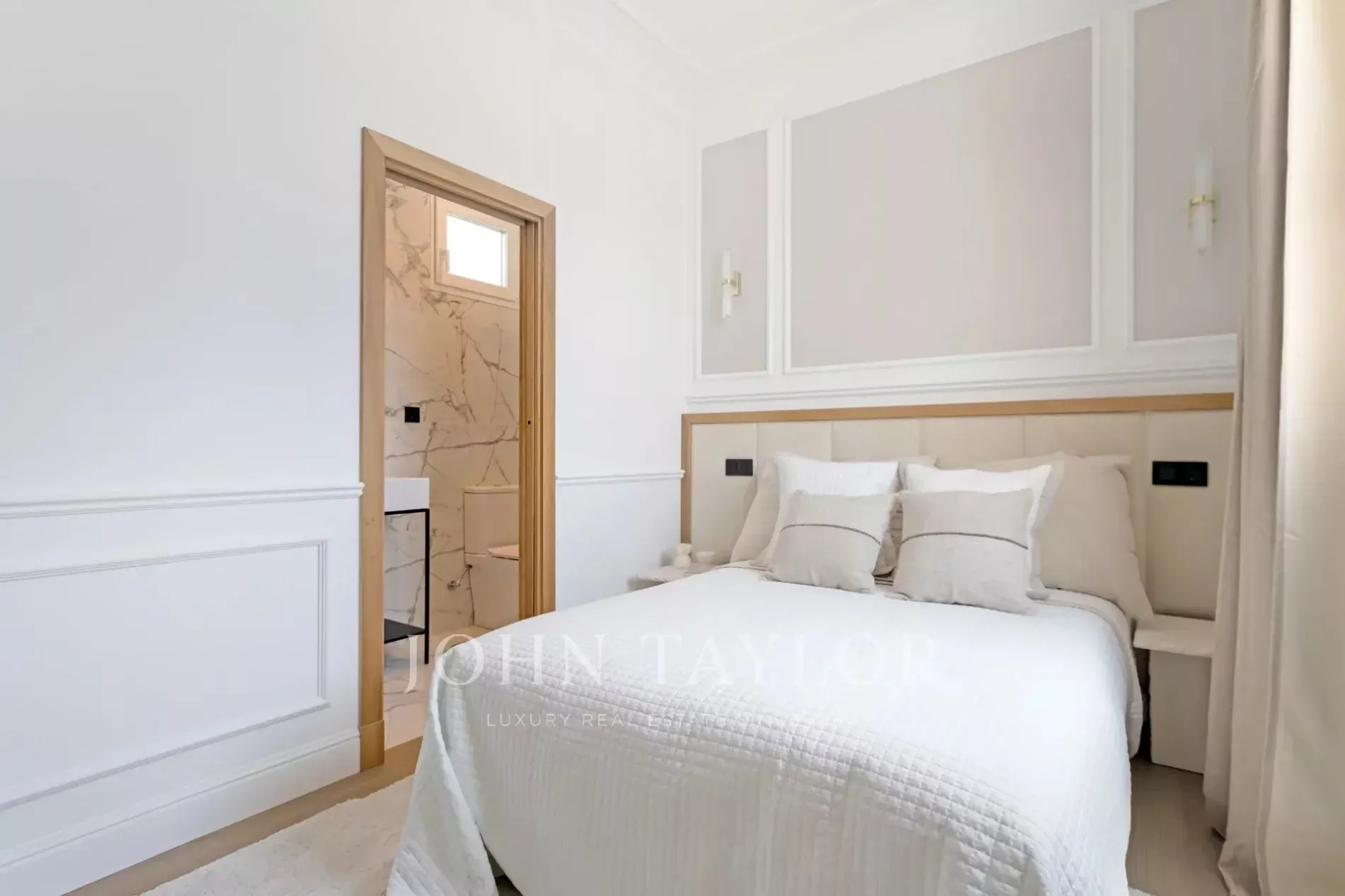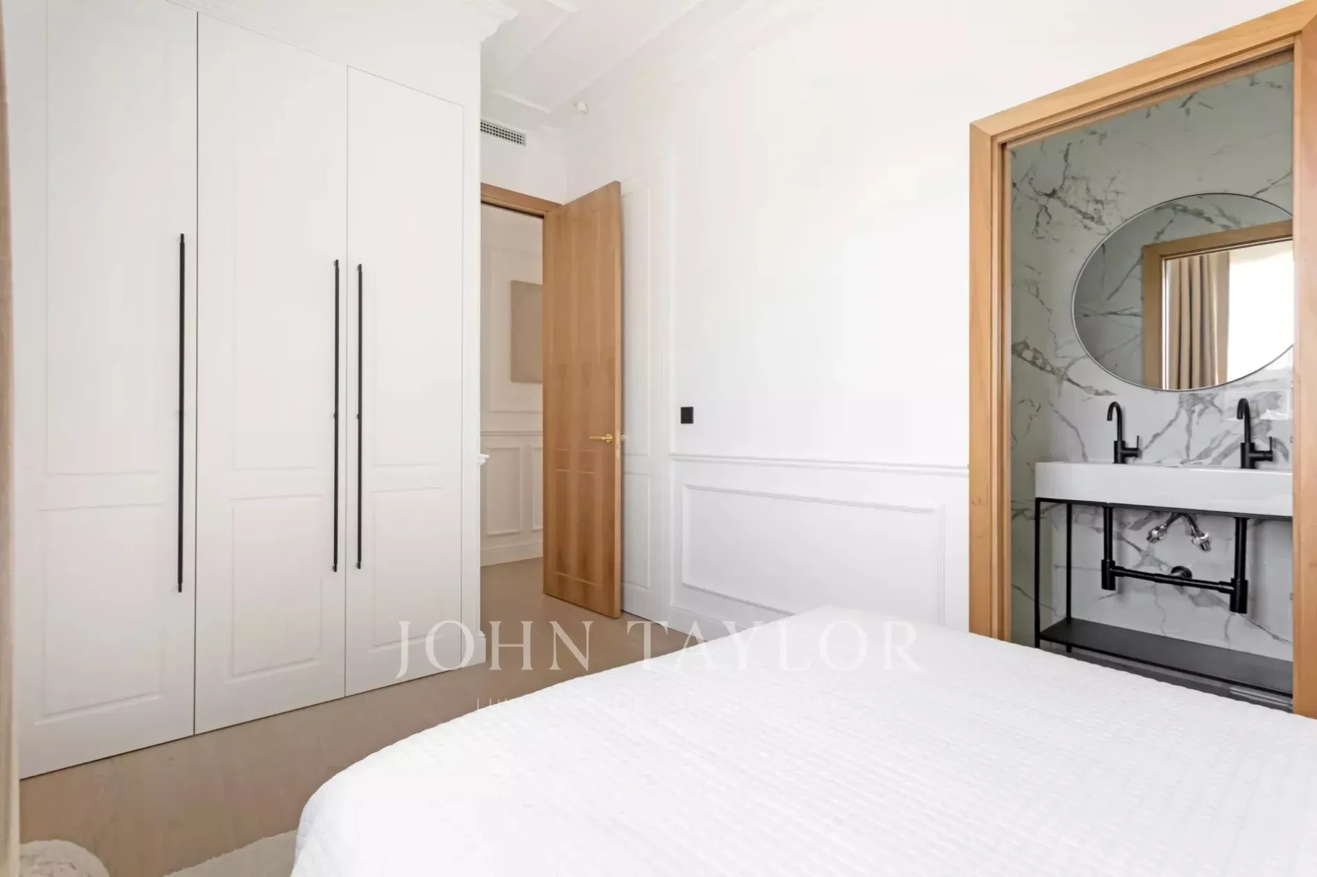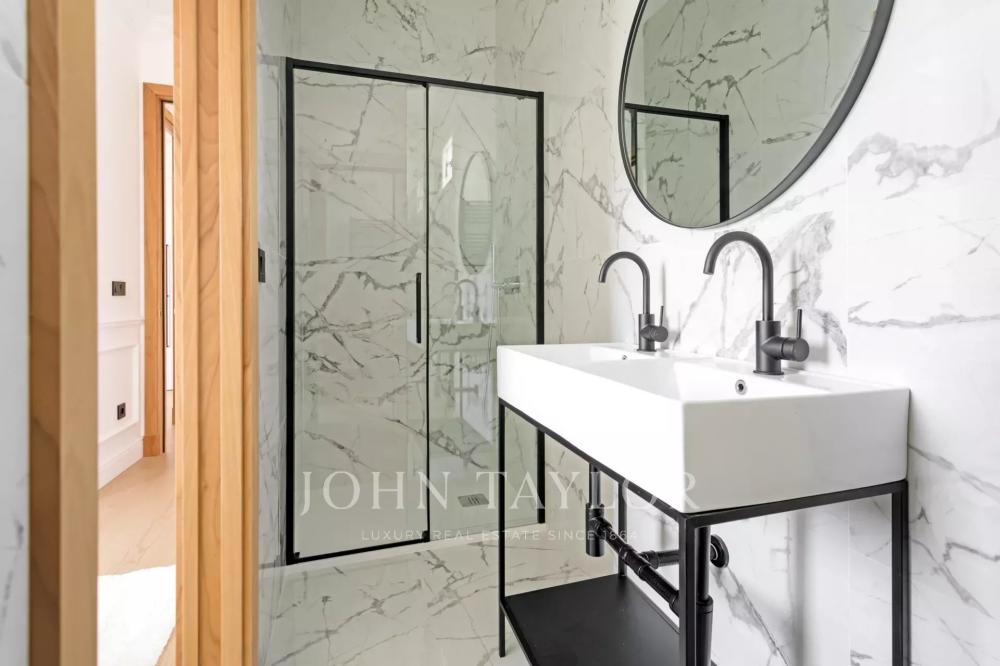 The private area is composed of two spacious bedrooms, both with fitted wardrobes and en suite bathrooms.