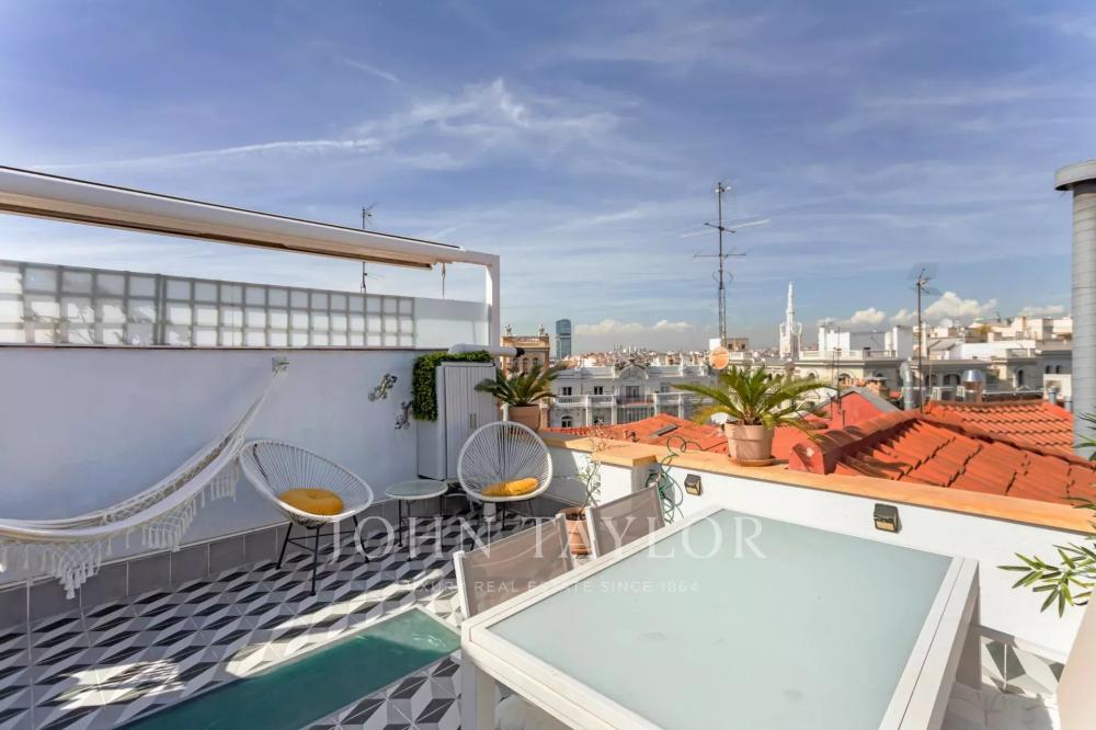 This duplex stands out for its spectacular terrace, which rises imposingly over the neighboring buildings, offering views of the Madrid sky with total privacy and no noise, thanks to its strategic location.