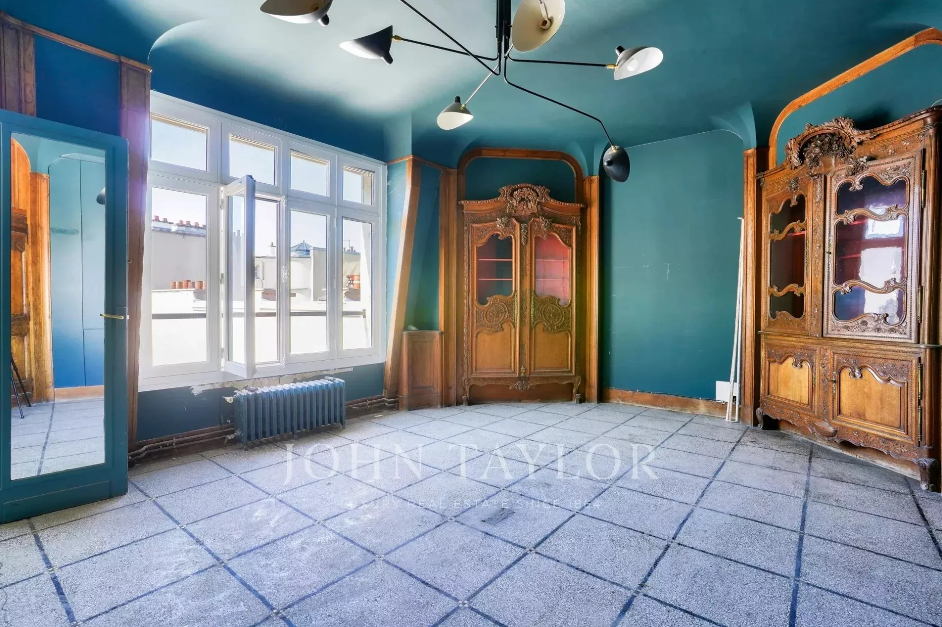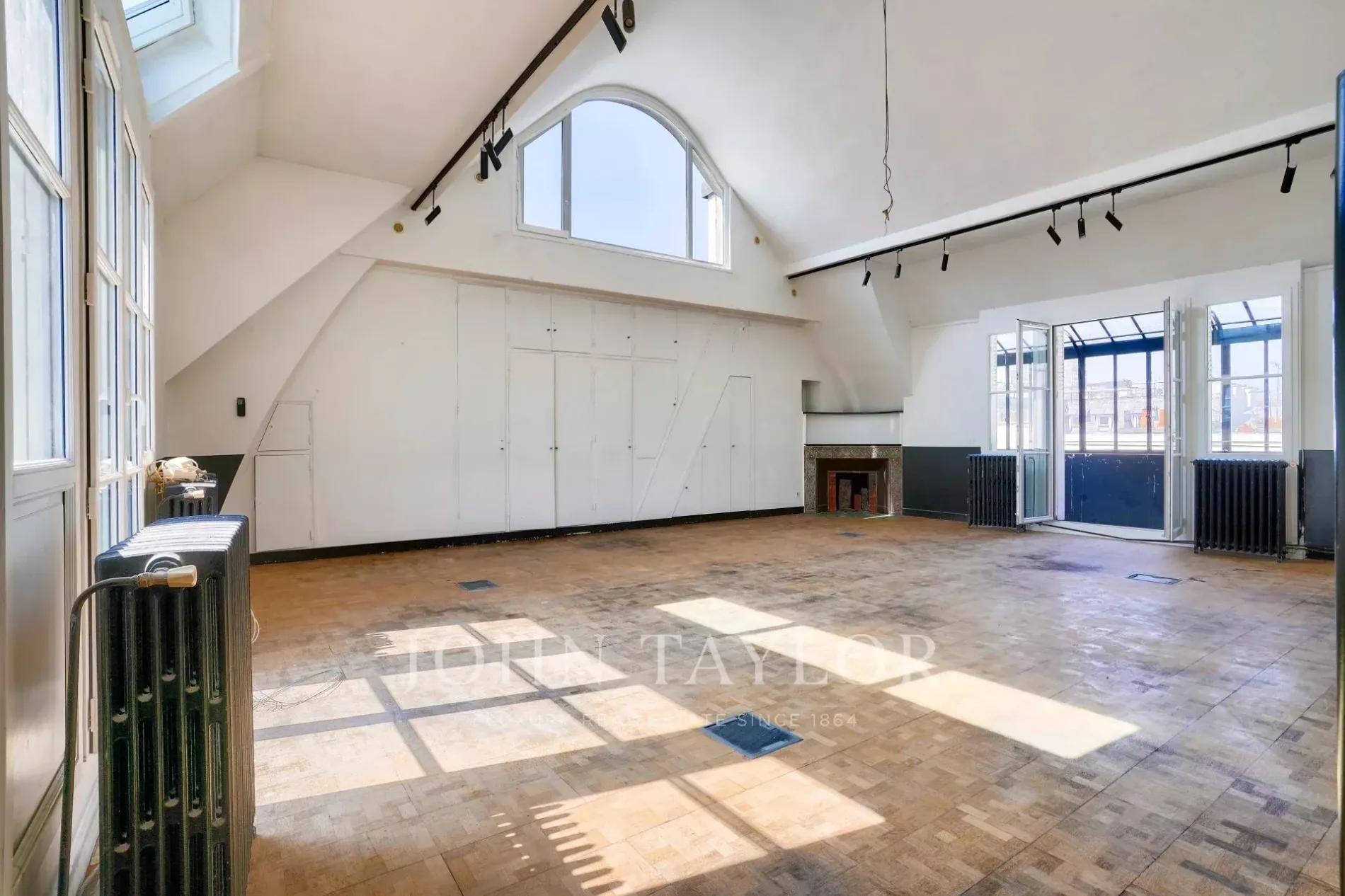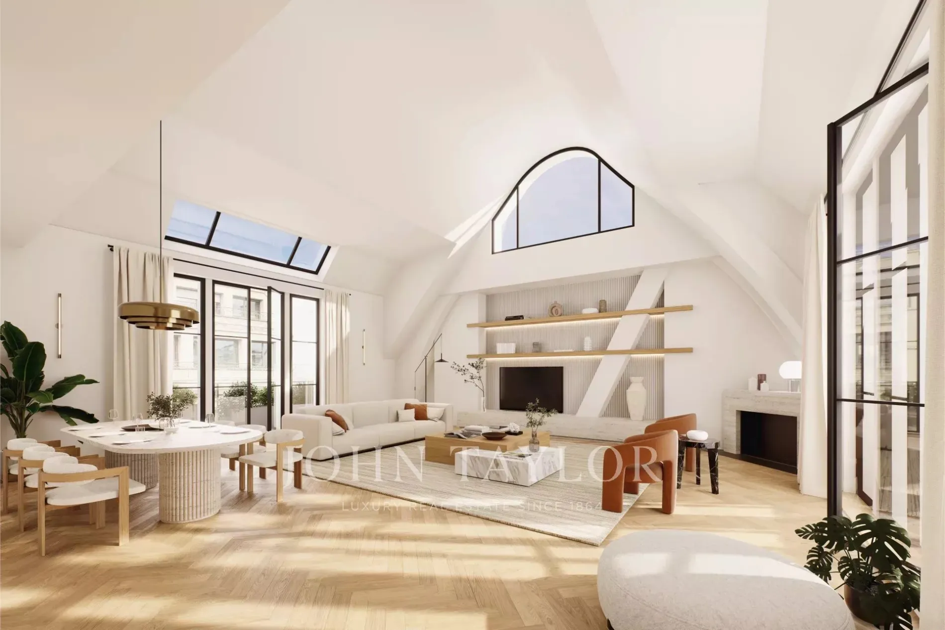 * A vast dual-aspect living room of over 60 m² with ceilings over 5 meters high, opening onto two terraces