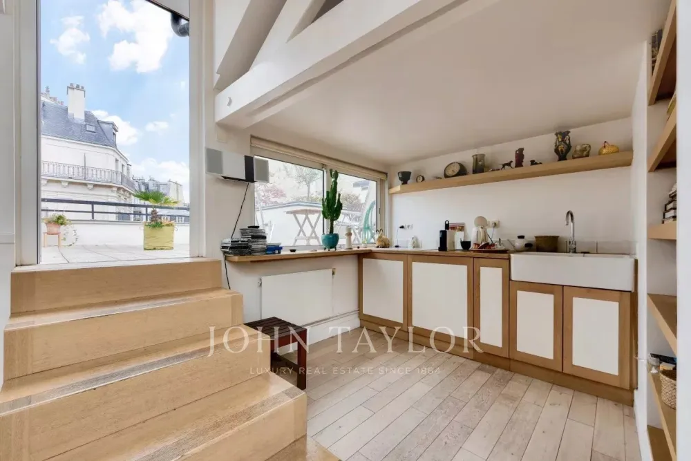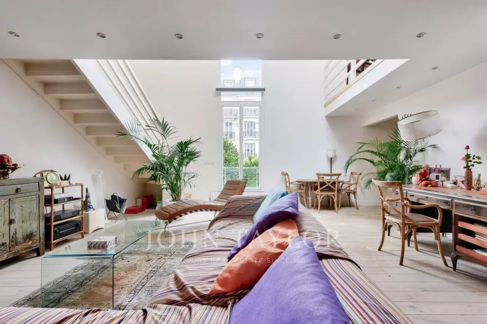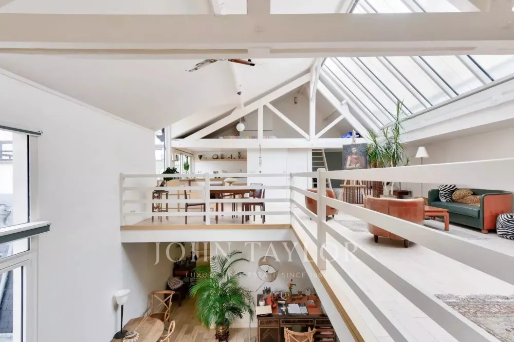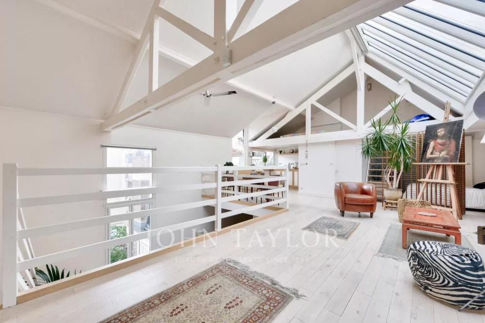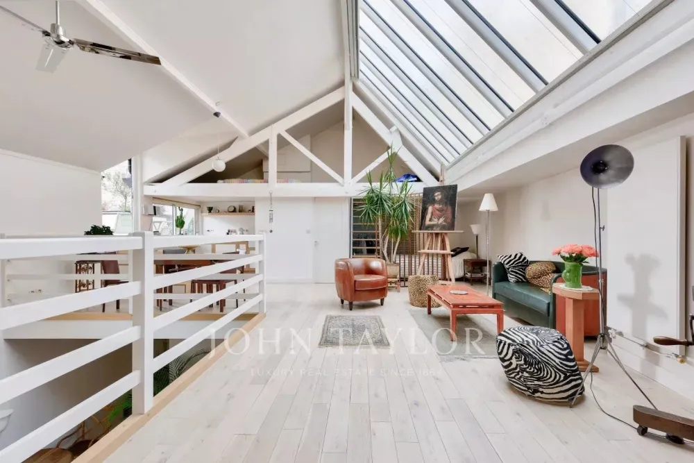 In a private mansion with refined communal areas, we offer you a 2-level artist's studio on the second and top floor, with 136 m² of floor space, 121 m² (loi carrez) and 33 m² of ground-level terrace.