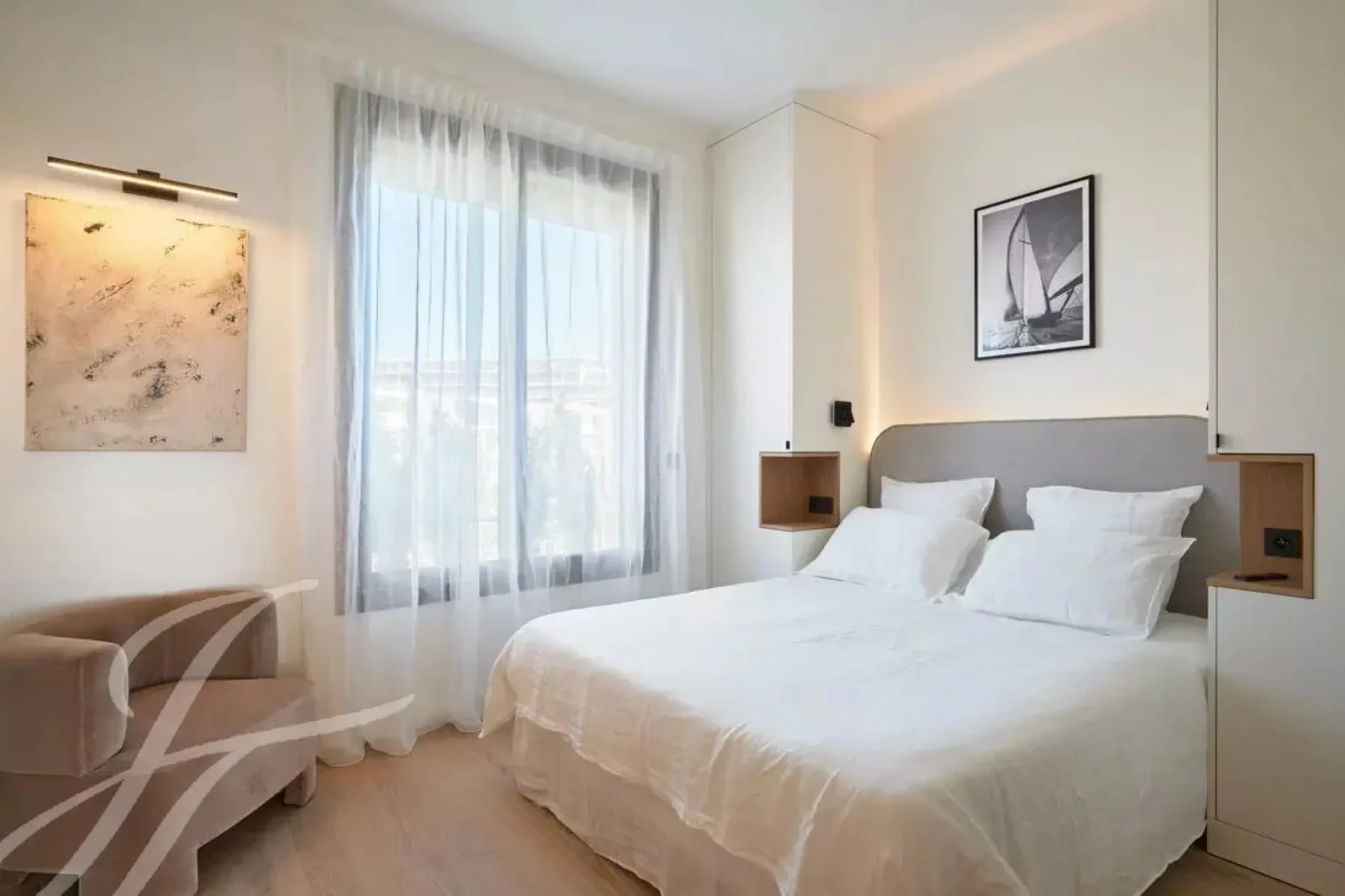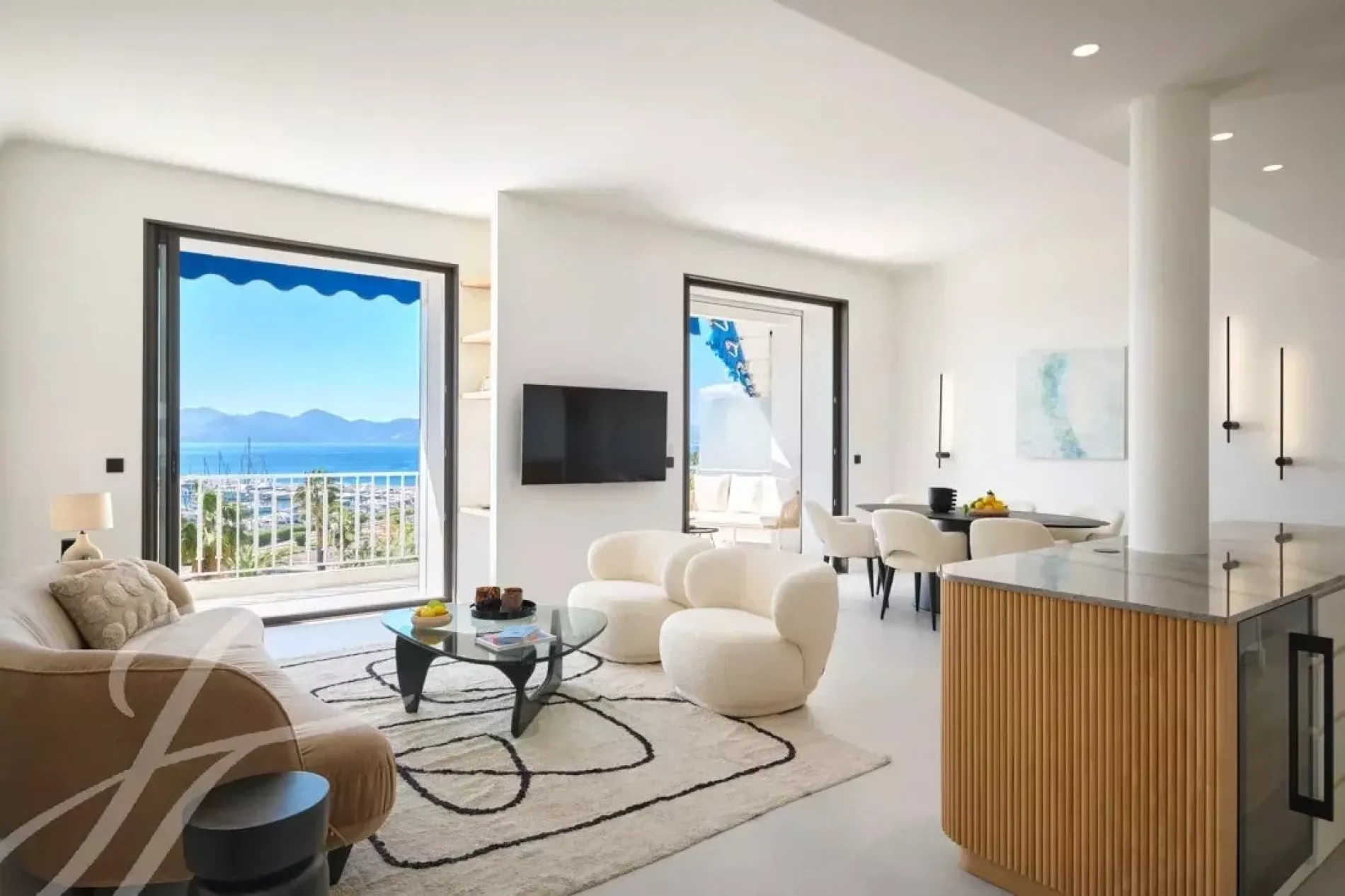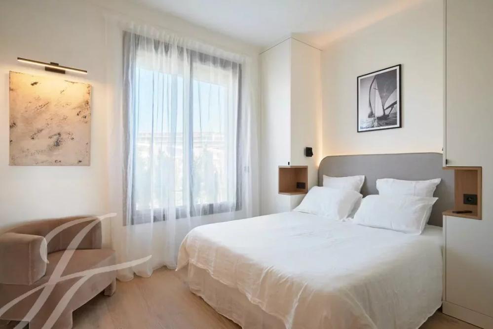 This exceptional apartment, facing the harbor, offers panoramic sea views stretching from the Bay of Cannes to the Esterel hills. With 100 m² of living space, the layout is optimal.