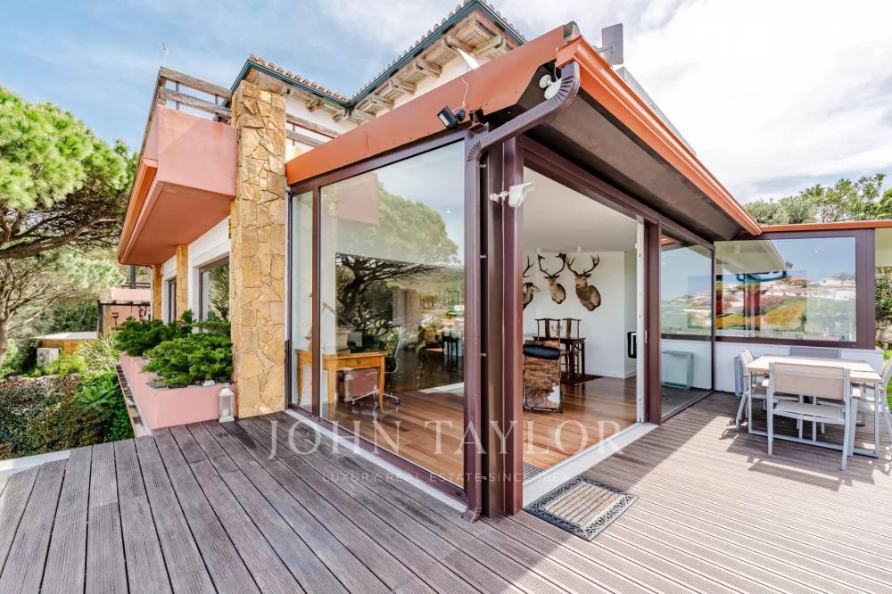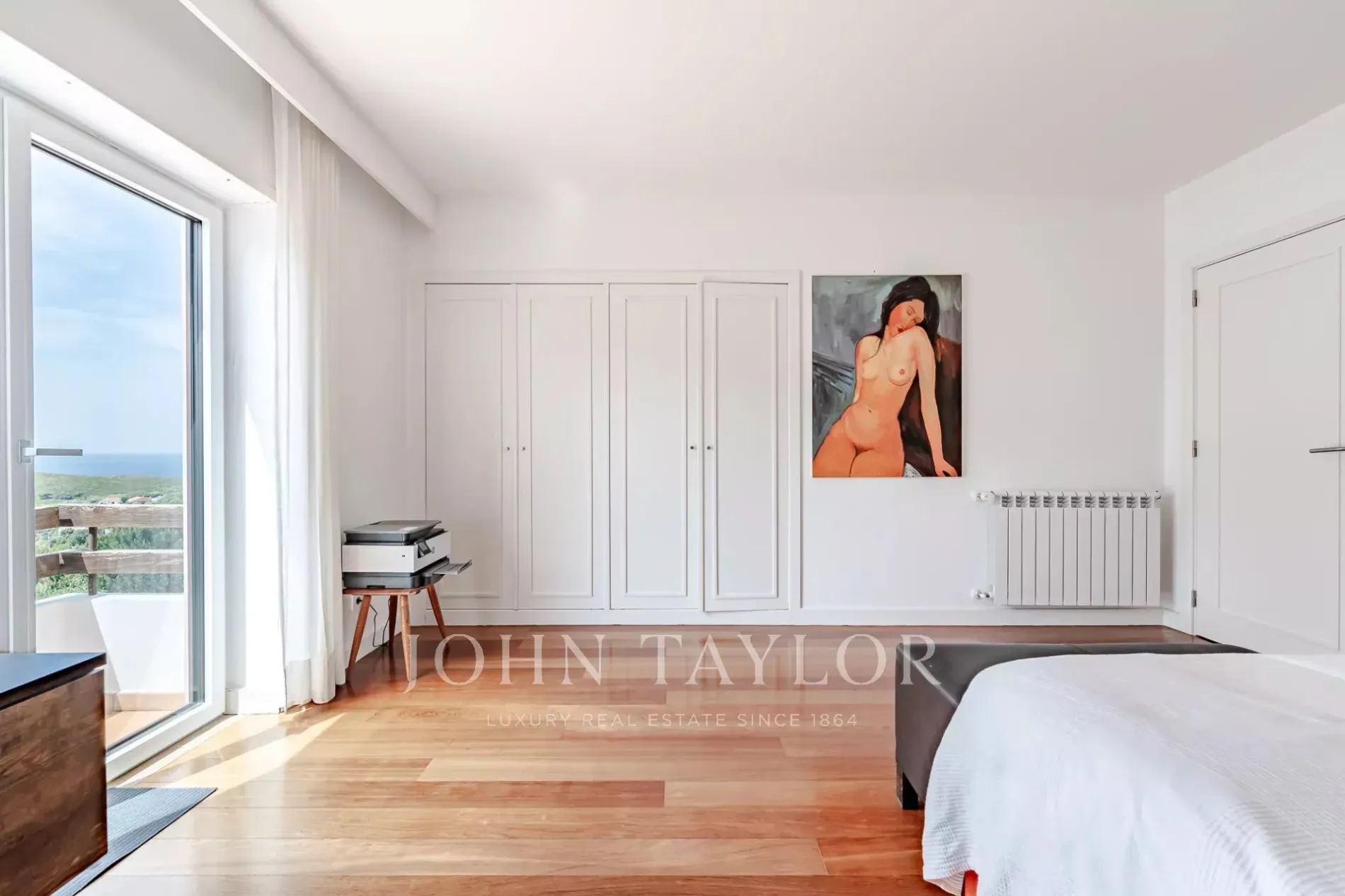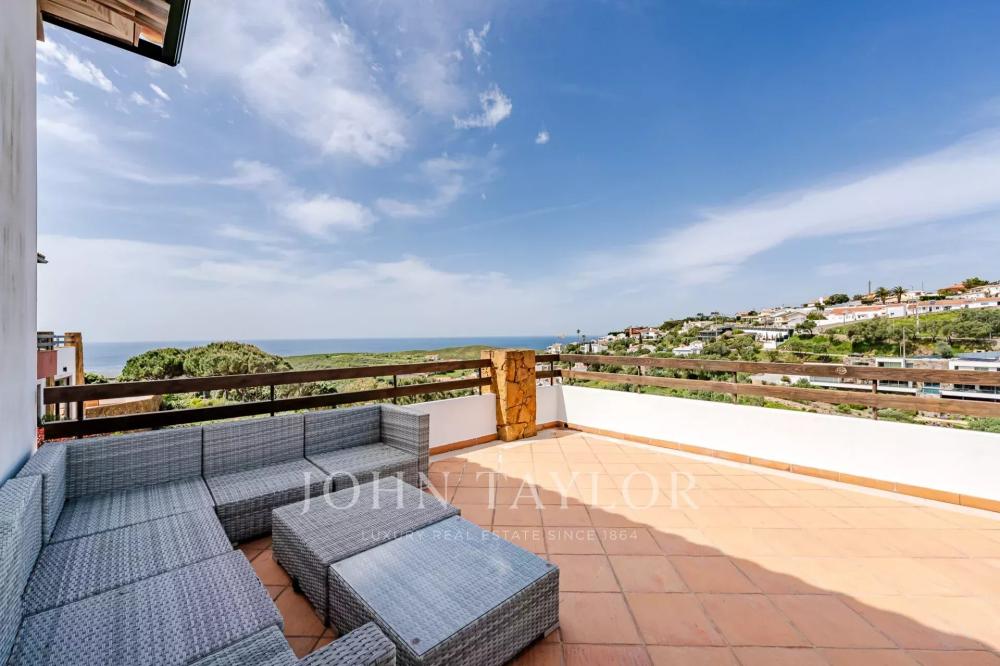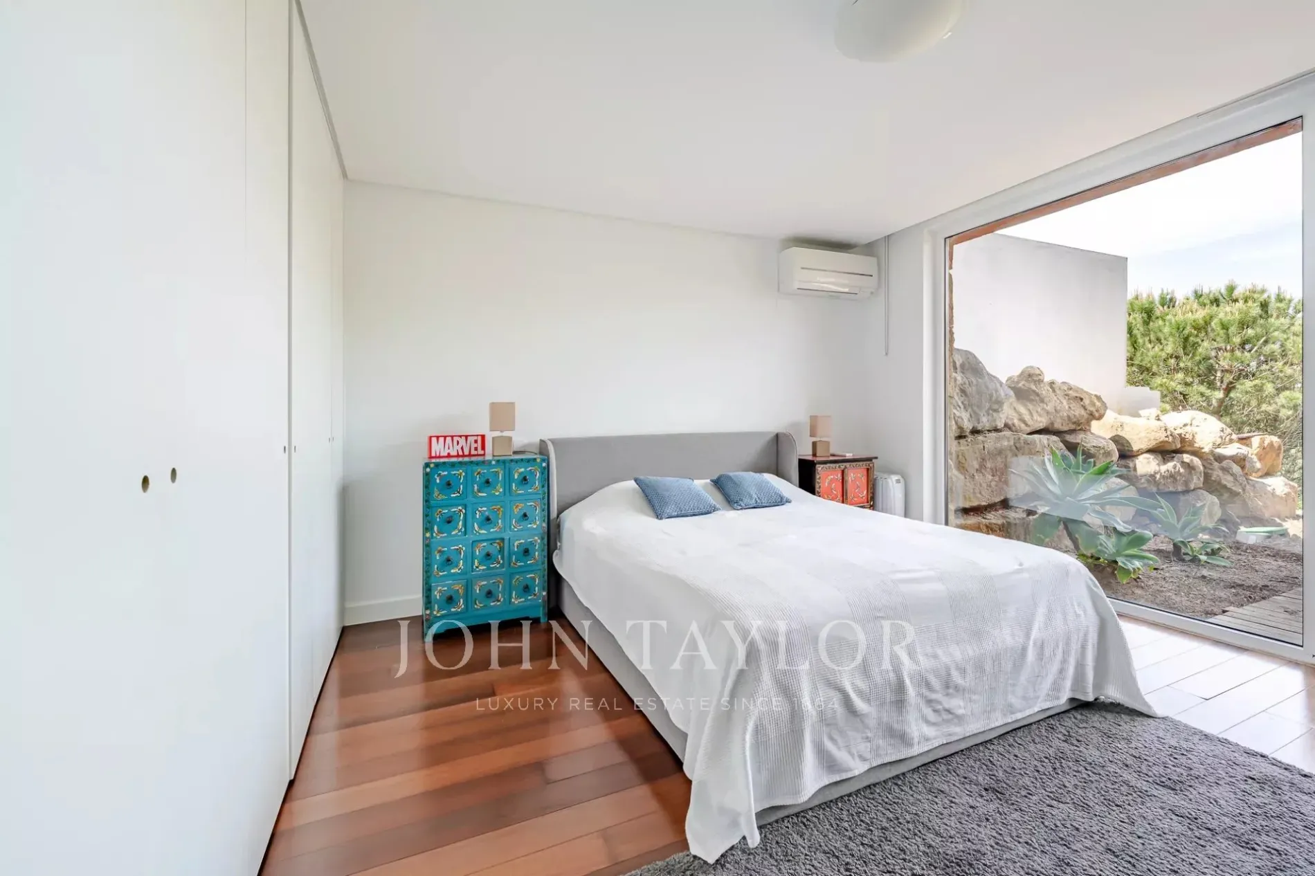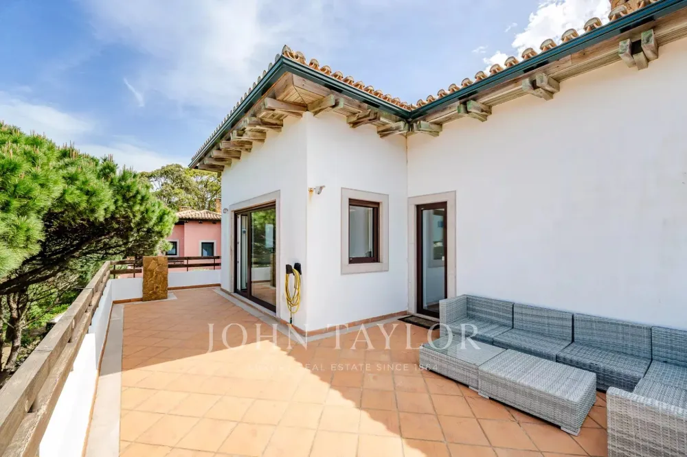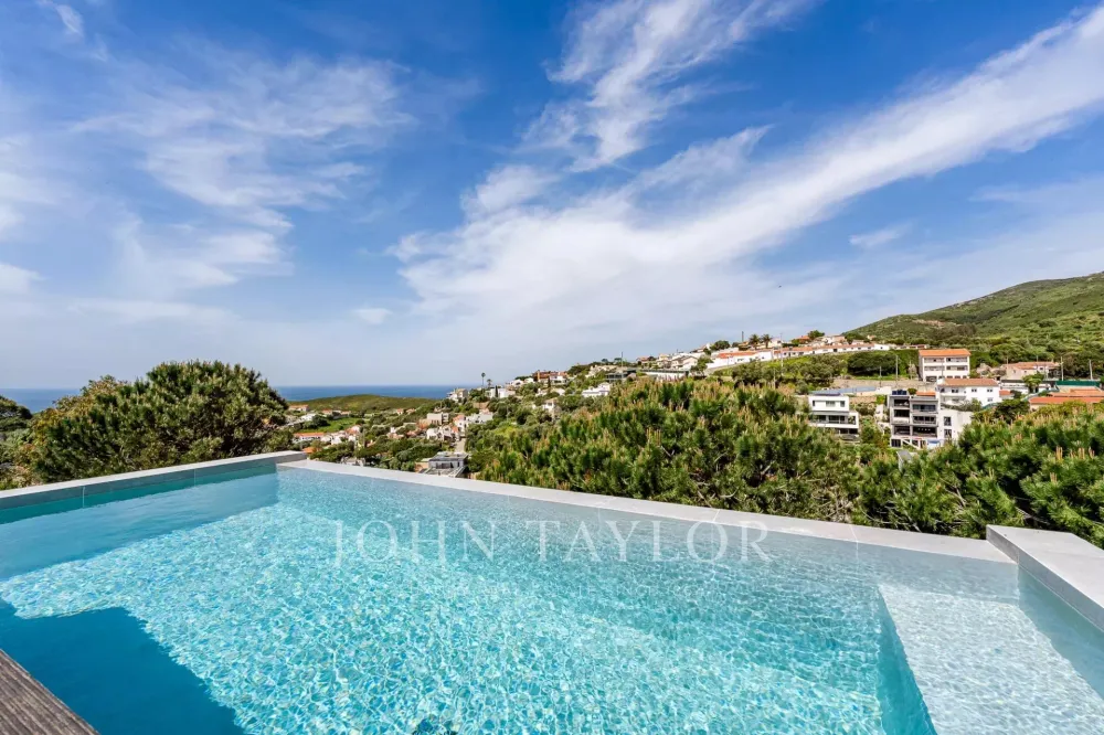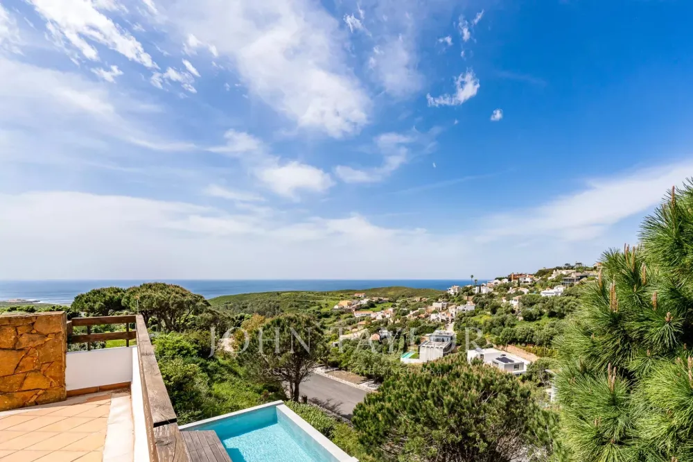 Located in a secure private condominium near Guincho Bay, this villa offers uninterrupted views of the Atlantic Ocean from multiple rooms and outdoor spaces. It stands out for its elevated position and open outlook, with the sea visible from the living areas, terrace, and private pool.