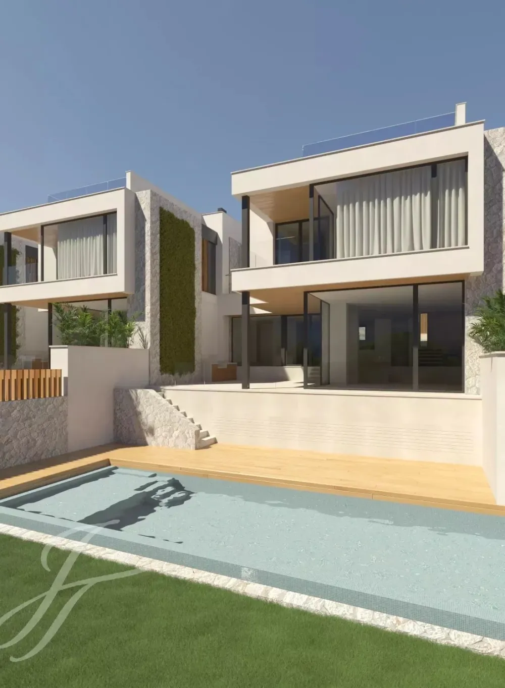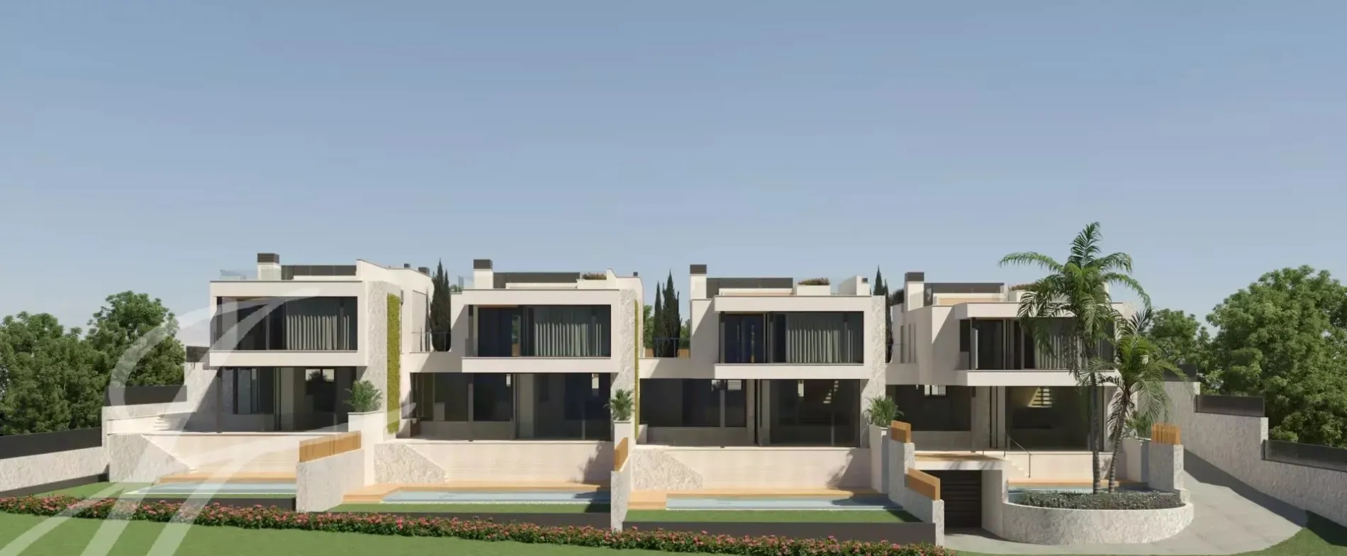 Each of the four villas boasts a generous 300 square meters of living space with four bedrooms on the top floor, three bathrooms and built-in wardrobes. On the ground floor the open plan distribution of the kitchen and the dining room with the living room on a split level connects seamlessly with the generous and intimate terrace, perfect for entertaining. The modern Mediterranean-inspired design is further enhanced by a stone façade and delicate carpentry, all contributing to the high-end feel of these new homes.