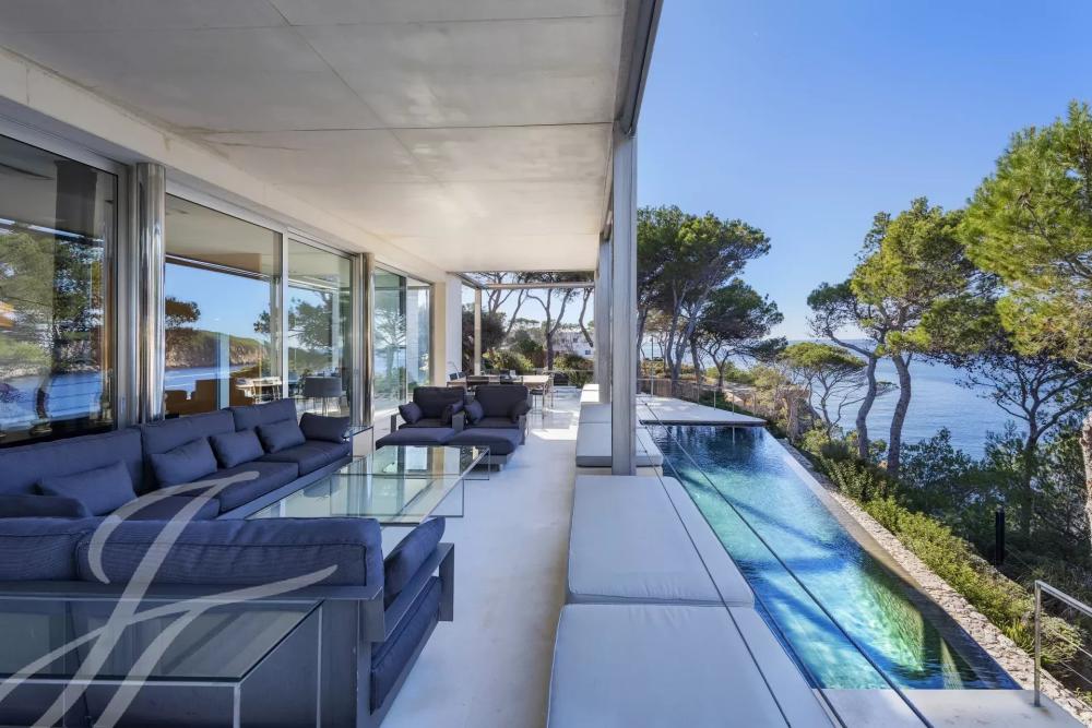 This marvelous first-line villa of 770 m2 offers spectacular views of the sea, the Malgrats islands, and direct access to the sea with a platform with a 15 years coastal concession. The villa is located very close to the super marina, Port Adriano, the four nearby golf courses, and only 25 minutes away from the elegant capital and the airport of Majorca. Optimal comfort, plenty of space, light and modern interior design with open living and dining areas, and flowing transitions to the outdoor areas give the villa a perfect ambiance for the Mediterranean lifestyle. Everything really has been thought of in this villa: the living areas are conveniently connected. Upstairs, in addition to the generous master suite with its own living room, there are four further bedrooms with en suite bathrooms. Then on the ground floor, there is a further suite complete with an en suite bathroom and two bedrooms sharing a bathroom ideal for staff. A spacious kitchen, living room, and dining room. In total 6 bedrooms with en suite bathrooms and 2 staff rooms with bathrooms.