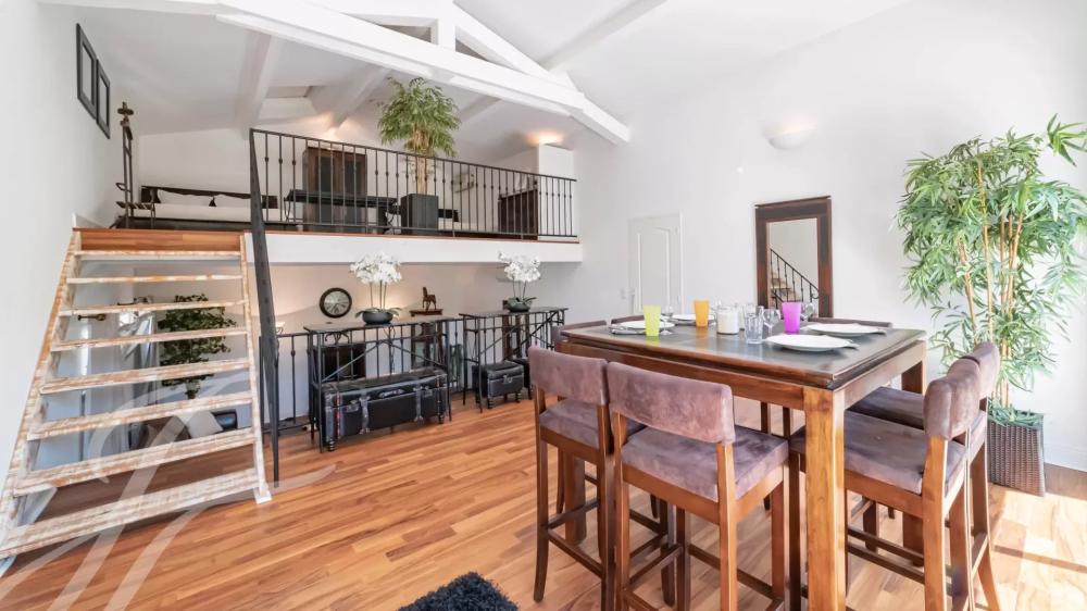 First apartment: dining room opening onto terrace, living room, mezzanine sleeping area, kitchen, bathroom and toilet, storeroom.
