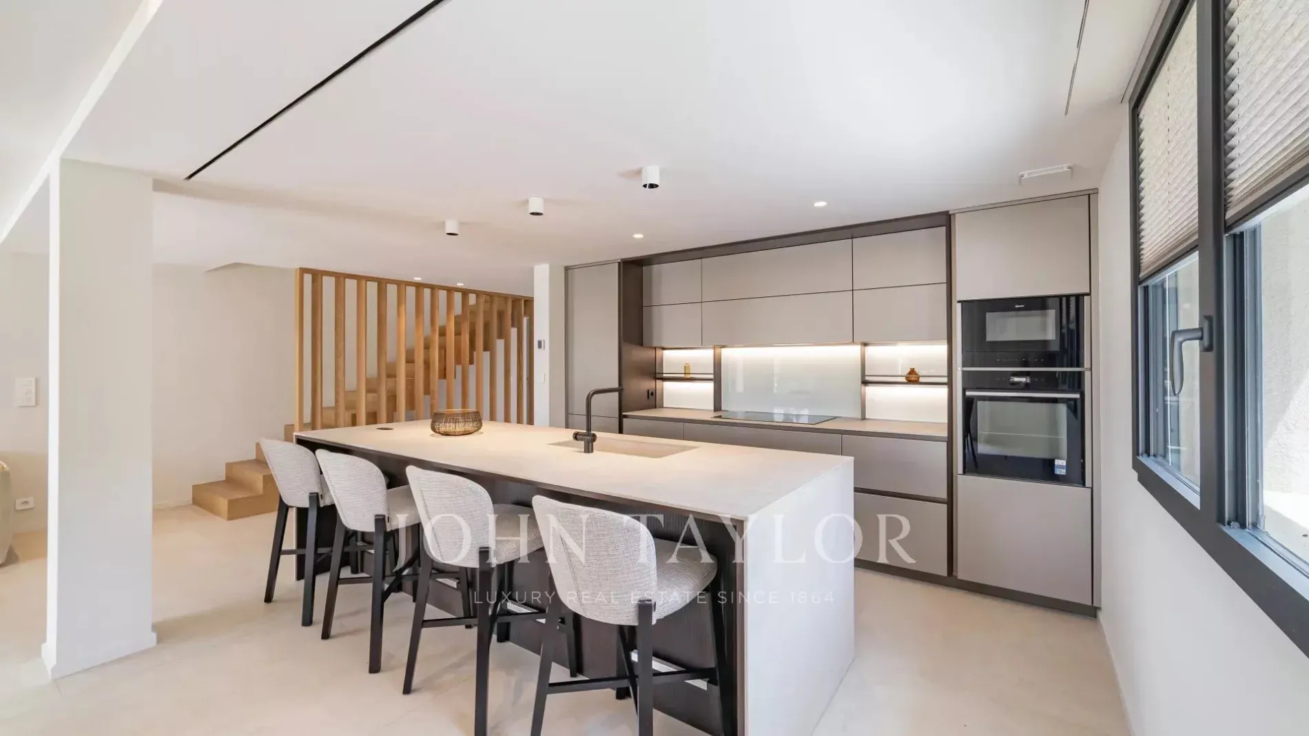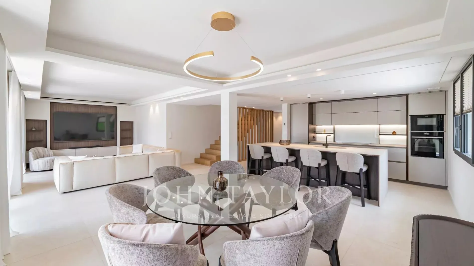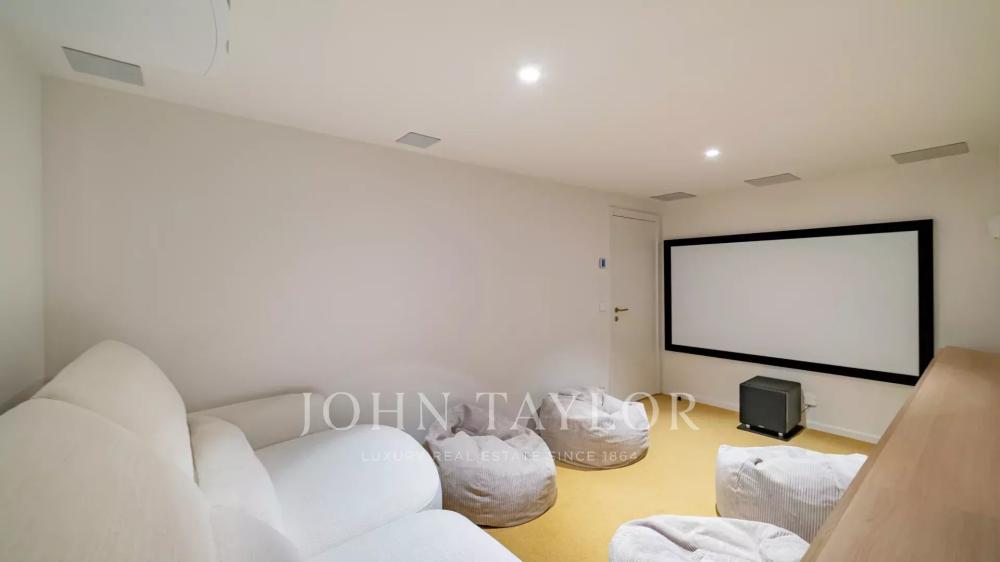 Garden level: fitness area, cinema room and an independent apartment comprising a living room with kitchen, bedroom and shower room.